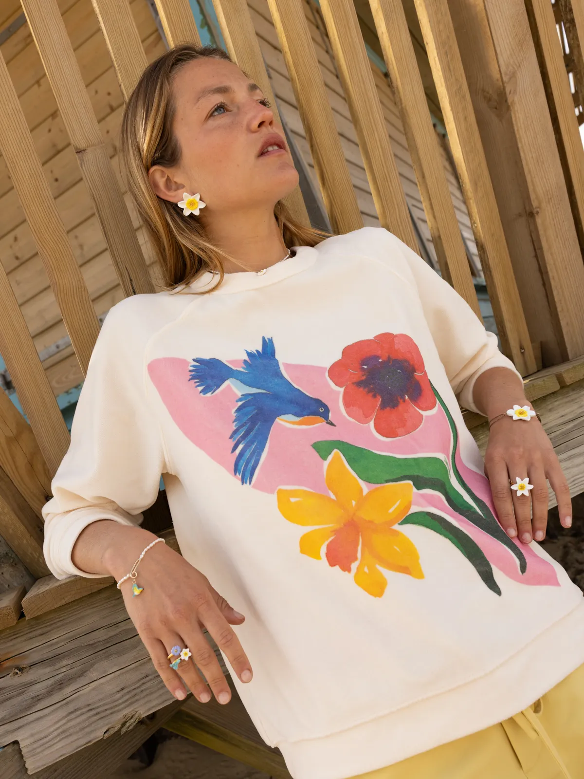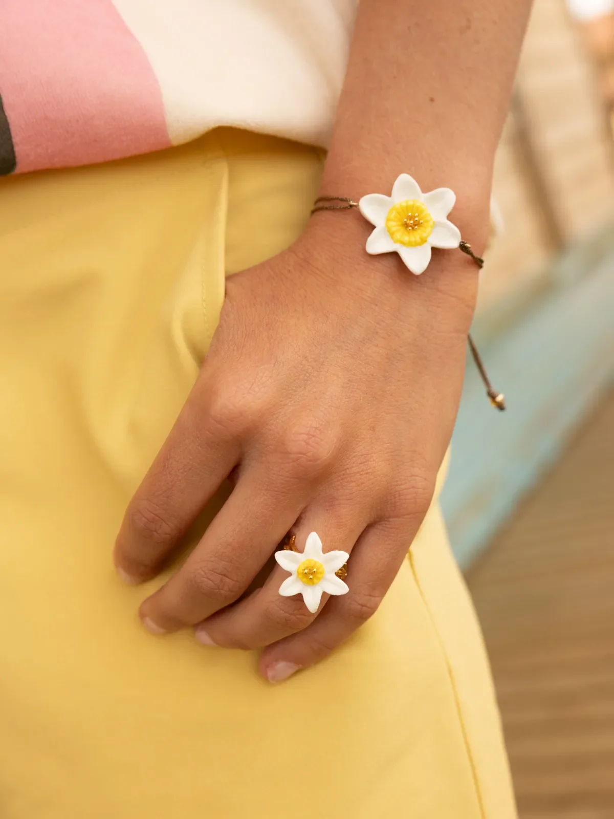 Bague ajustable en porcelaine et laiton doré à l’or fin.