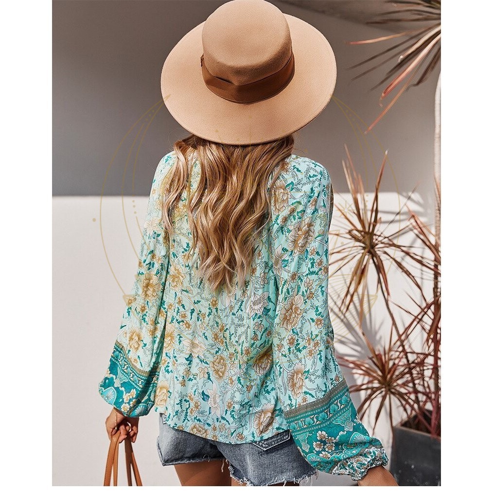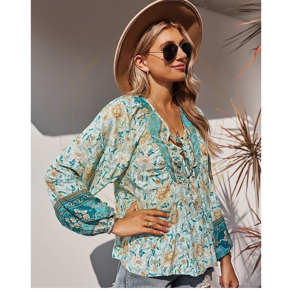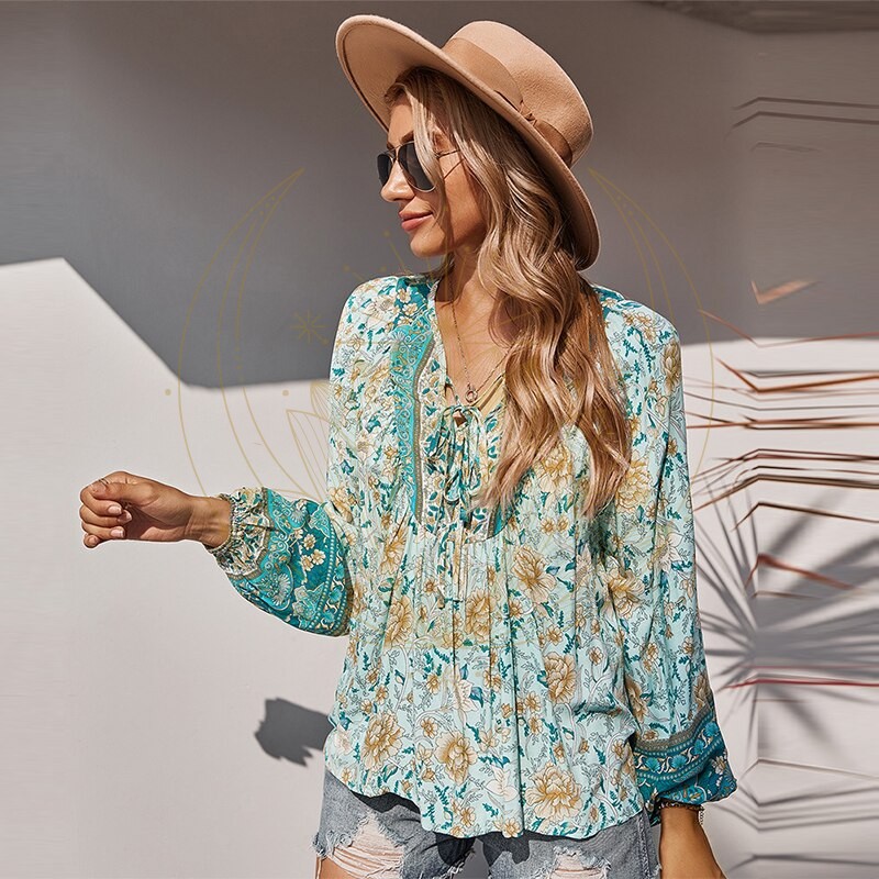 Cette charmante blouse bleu bohème ornée de motifs floraux et ethniques au bout des manches est un élément essentiel de la mode bohème. Son imprimé aux teintes orangées et bleues, très naturelles, évoque parfaitement l’esprit bohème.