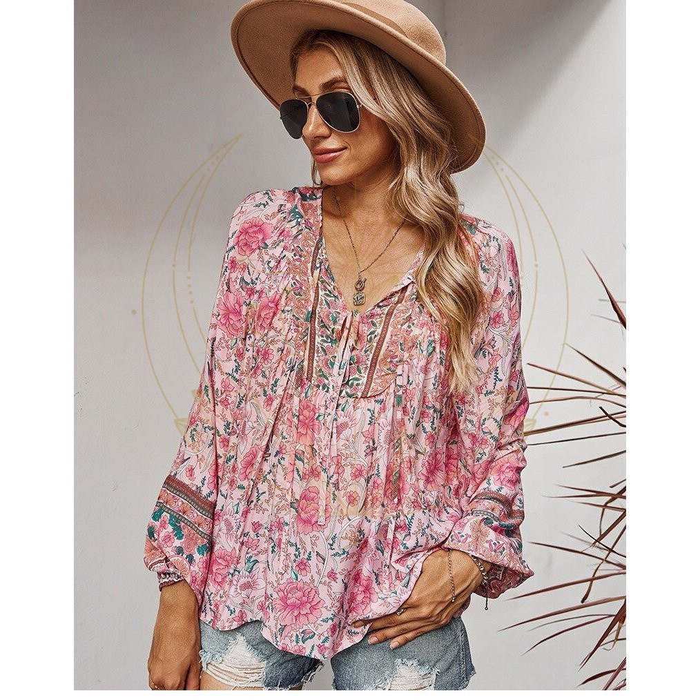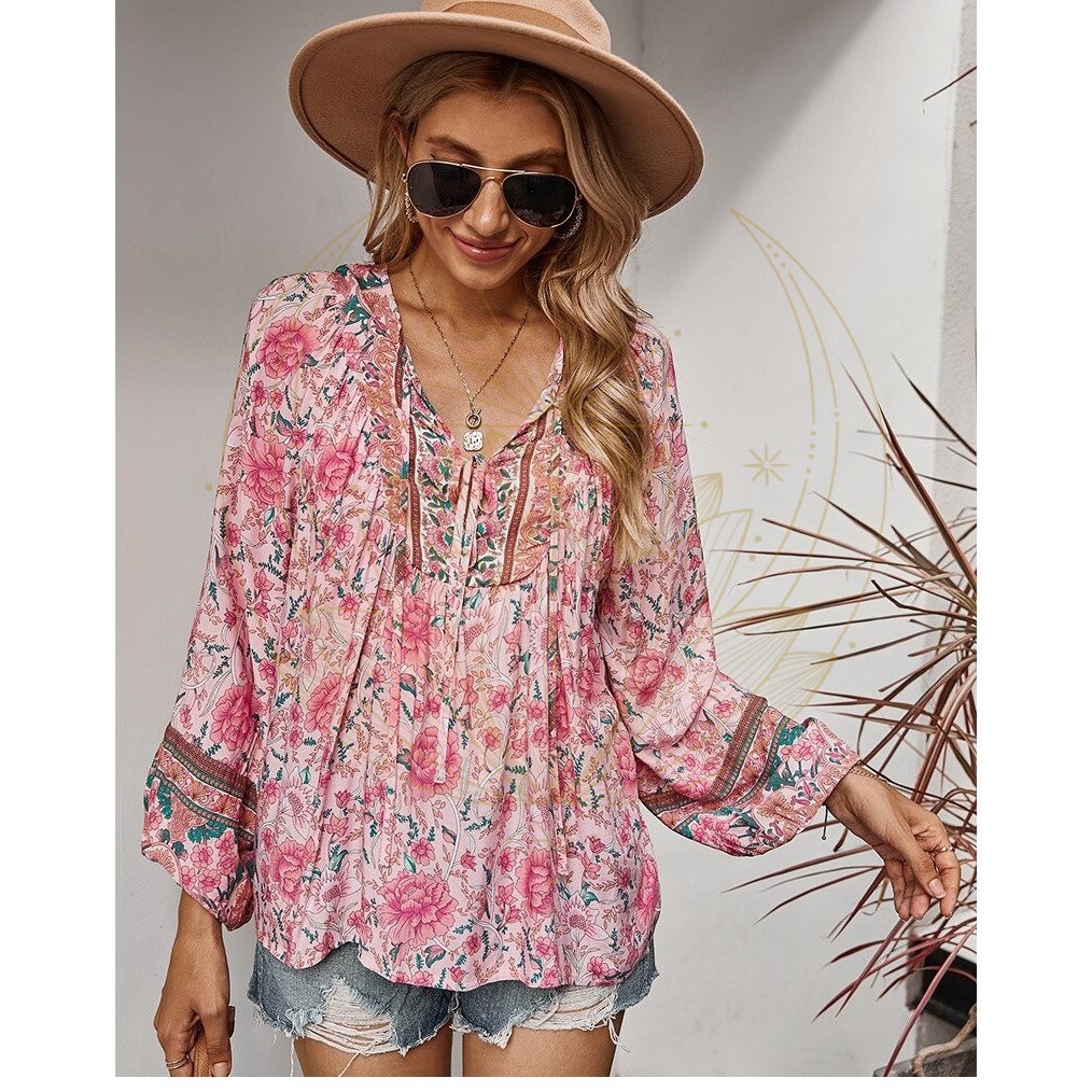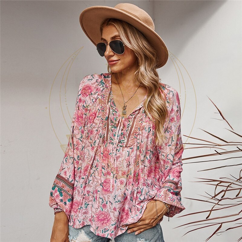 Idéale, la blouse bohème vintage se veut être la blouse hippie par excellence. Pourquoi donc ? Elle est ample et fluide, munie de manches longues légèrement évasées, et arbore des imprimés fuchsia et de teintes pastel qui s’alignent parfaitement avec la mode hippie.