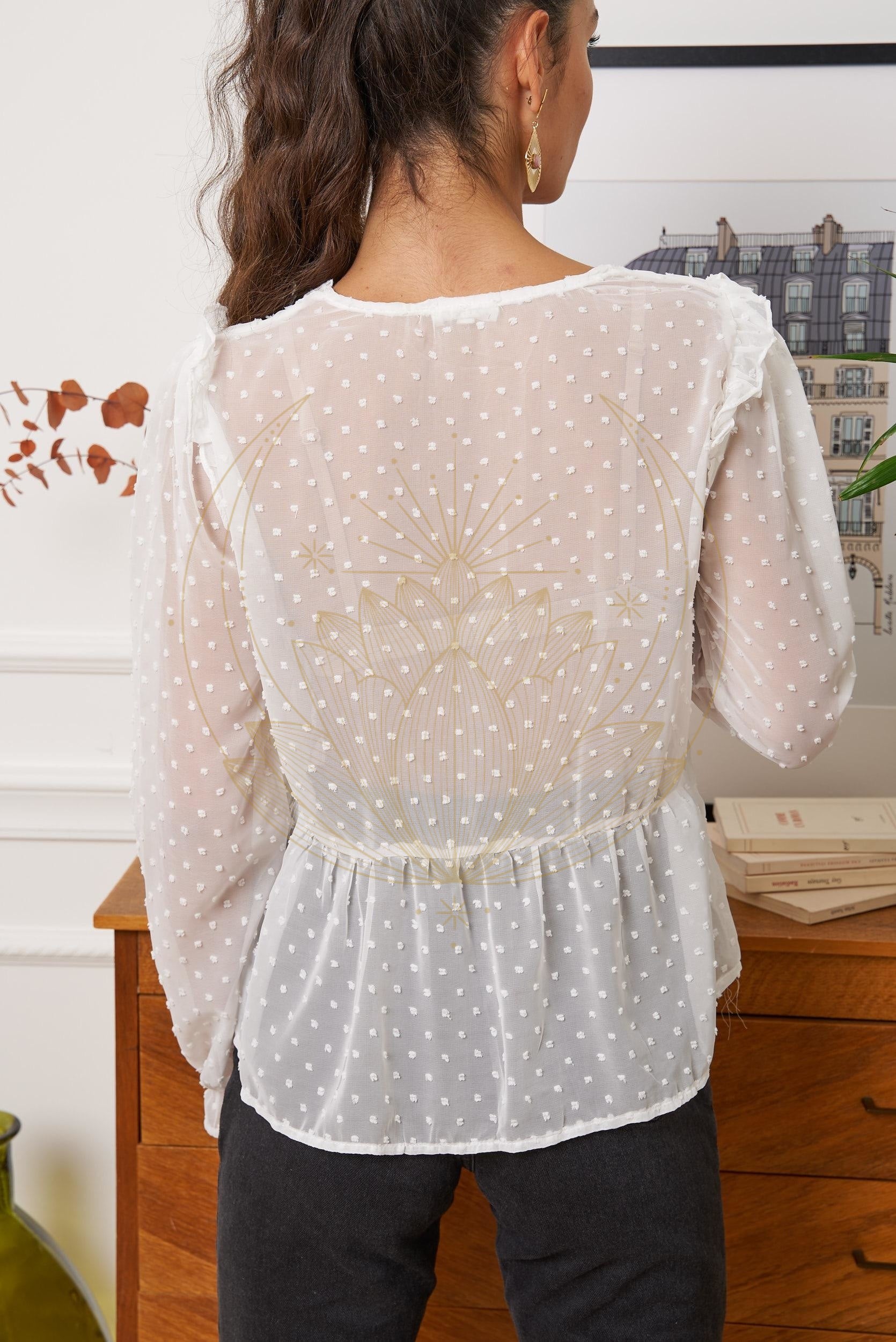 Adoptez la blouse blanche au charme romantique avec son design délicat en dentelle. Composée de doublure, de pois texturés et de manches transparentes, cette blouse à l’esprit bohème fait chavirer les cœurs ! Que vous la rentriez dans un jean ou que vous la portiez librement, une chose est certaine : elle sera vite un incontournable de votre dressing !
