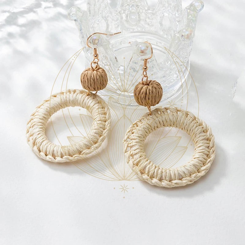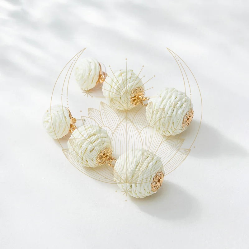 La fixation est ornée d’une boule blanche ronde en rotin, ajoutant une touche finale charmante à ces bijoux exceptionnels.