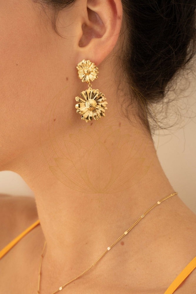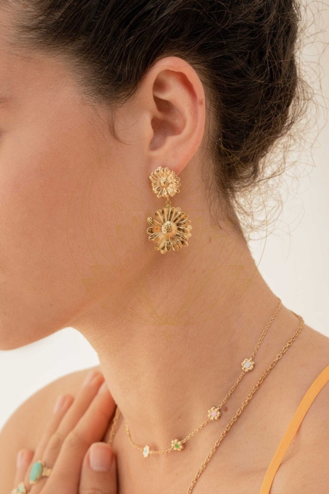 Boucles d’oreilles en acier inoxydable avec deux fleurs texturées ressemblant à des marguerites. Elles sont garanties sans nickel, sans cadmium et sans plomb. Résistantes à l’eau, elles ne noircissent pas.