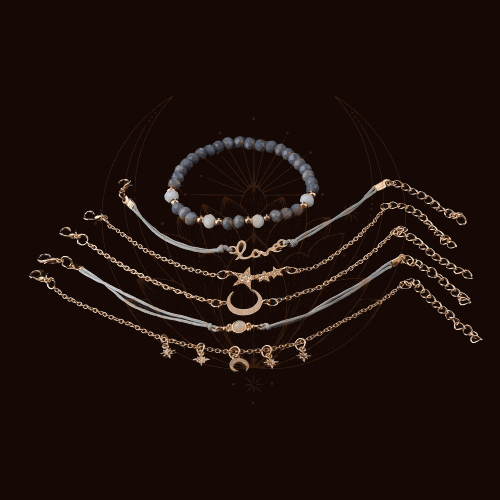 Parfaire votre style bohème avec cet ensemble de bracelets à motifs bohèmes. Ces bracelets au design céleste et lunaire vous transporteront dans un univers onirique unique.