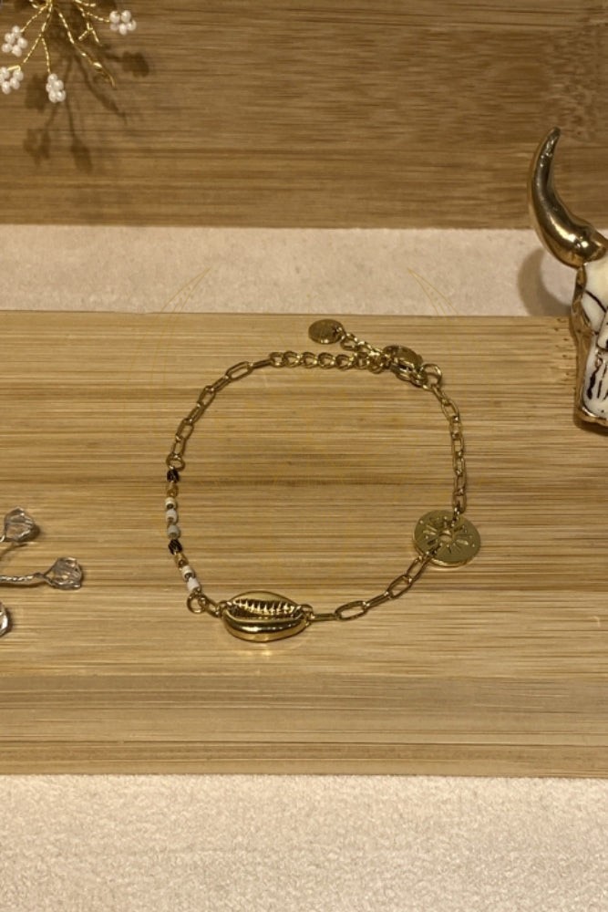 Ce bracelet bohème évoque la plage et les vacances ensoleillées. Il sera votre compagnon idéal tout au long de l’été. Bracelet doté d’une chaîne à grosses mailles, ornée de petites perles, d’un coquillage doré et d’un motif soleil.
