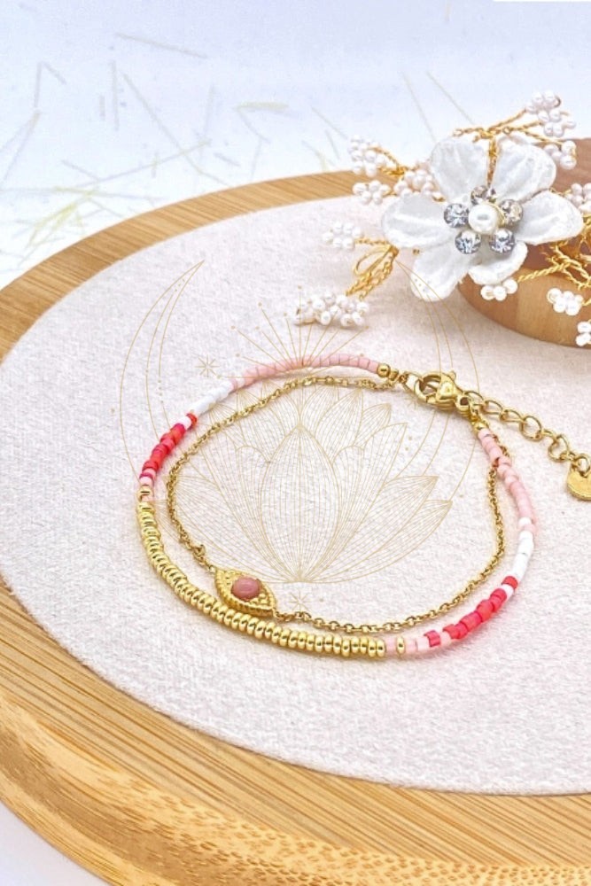 Bracelet bohème délicat avec perles roses et œil minuscule