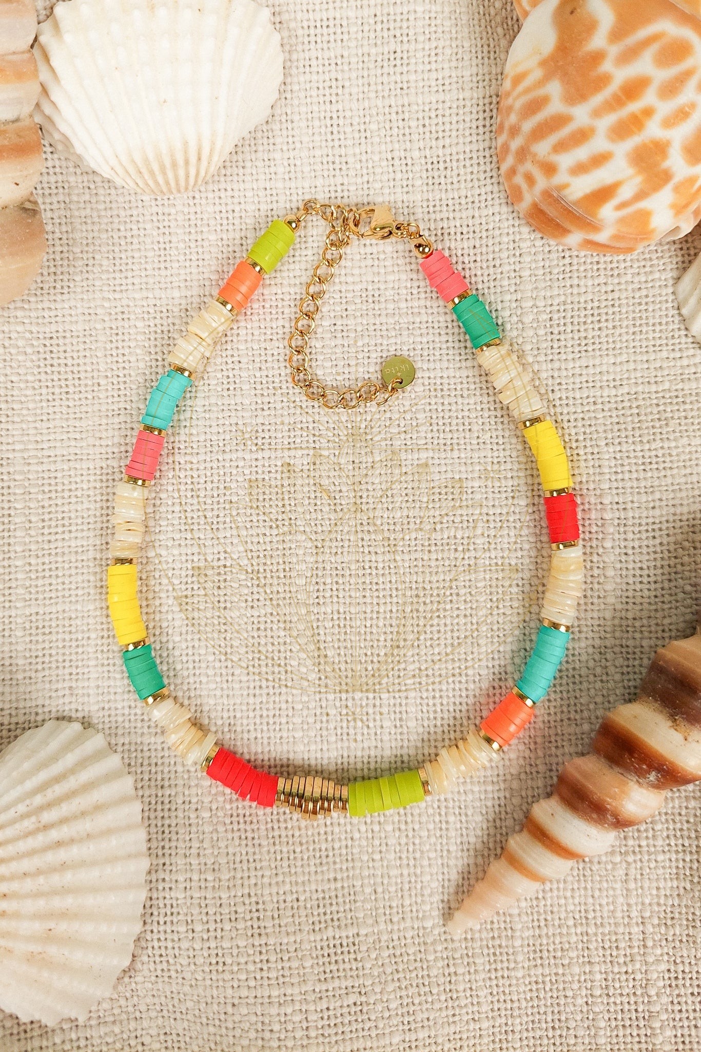 Enrichi de perles heishi multicolores, cet anklet de style bohémien ajoute une touche colorée inattendue. Portez-le avec des sandales ou pieds nus sur la plage. Léger, il s’adapte à toutes les chevilles grâce à sa chaîne ajustable.