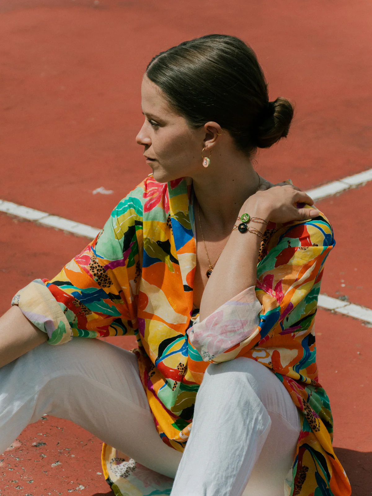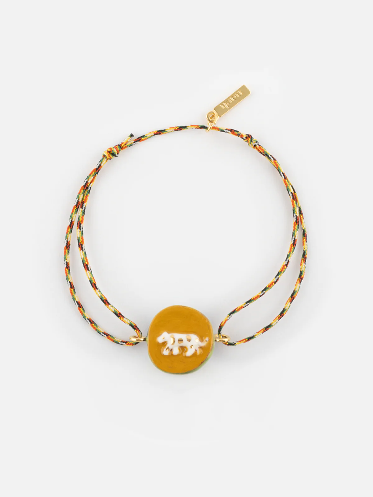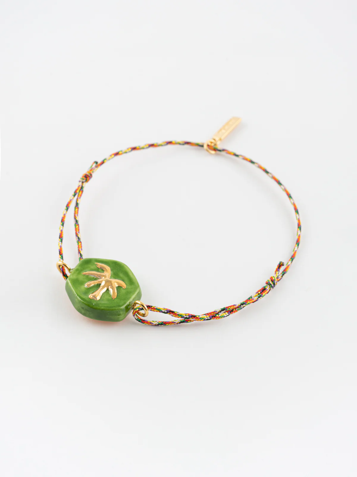 Bracelet en porcelaine, perles de verre et laiton doré à l’or fin. Métal certifié sans nickel et sans risque d’allergie.