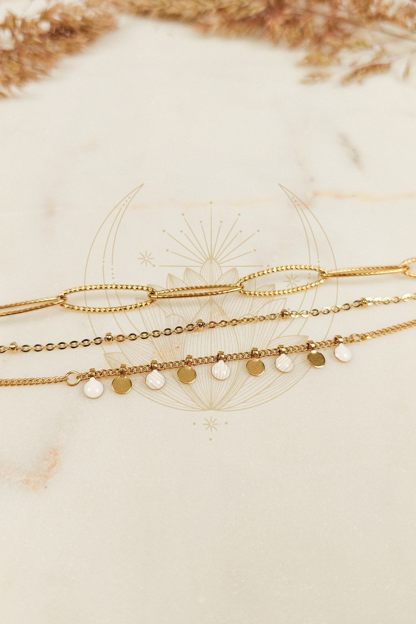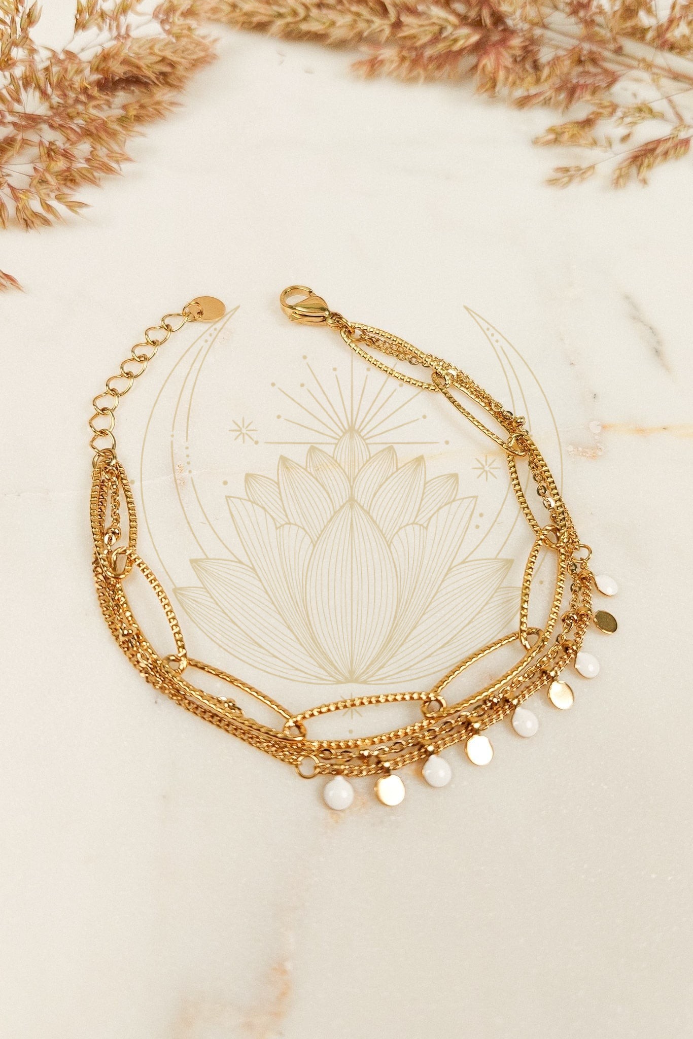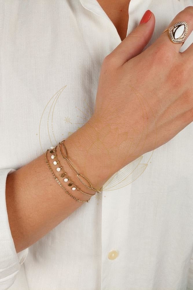 Sublimez votre poignet avec ce magnifique bracelet bohème multicouche. L’alliance de ses différentes chaînes est tout simplement irrésistible : une première chaîne à larges mailles, une deuxième avec un effet bille, et une dernière décorée de pampilles blanches et dorées.
