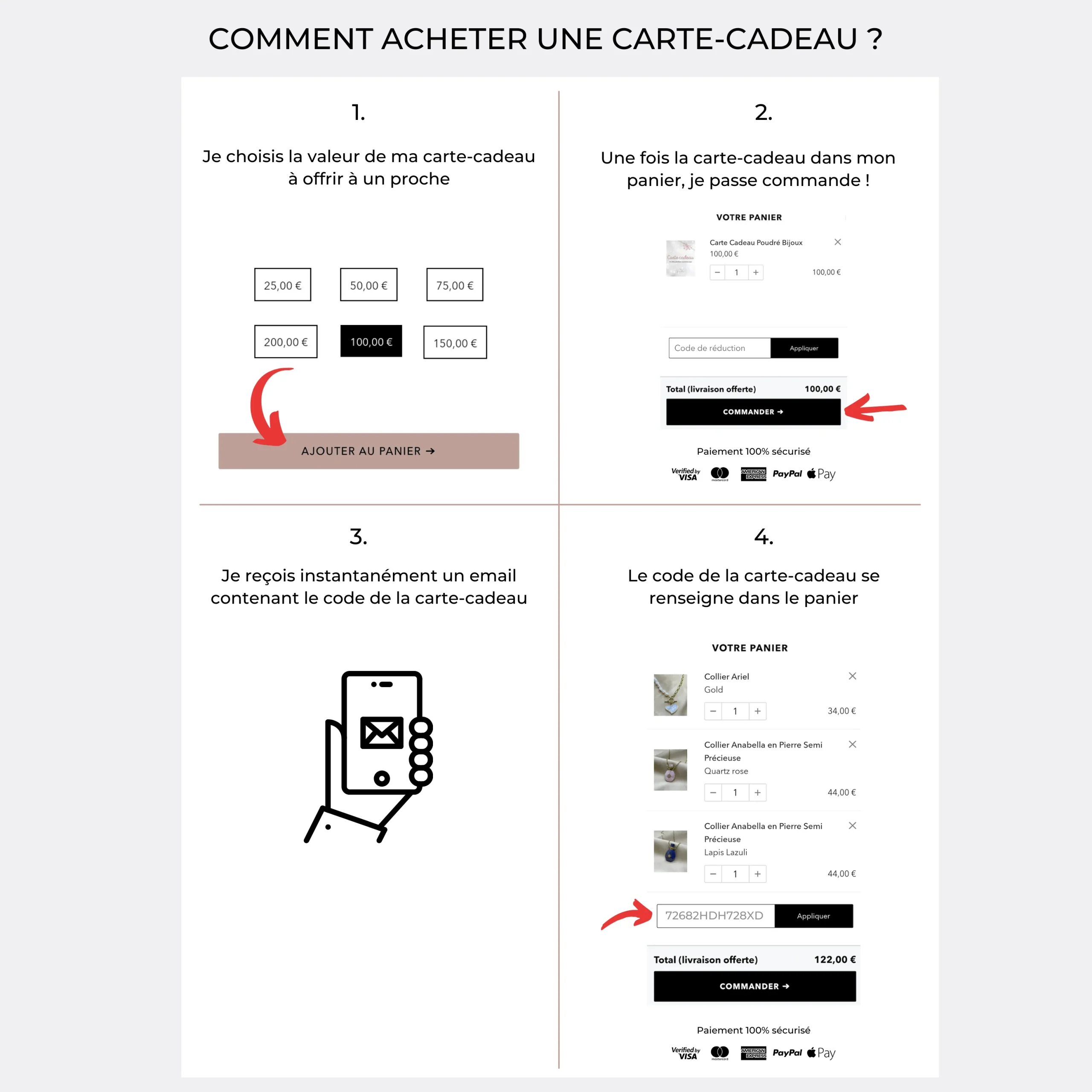Inutile d’attendre une livraison, ta carte cadeau te sera envoyée instantanément par e-mail !