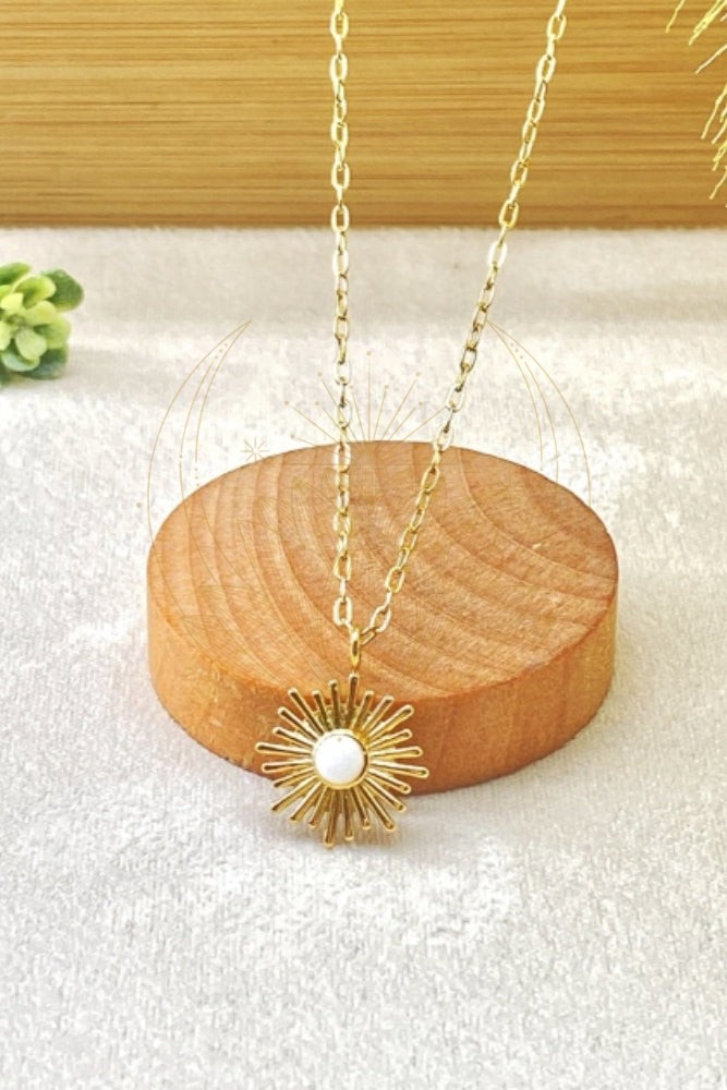 Collier style bohème chic avec délicate chaîne et motif soleil blanc