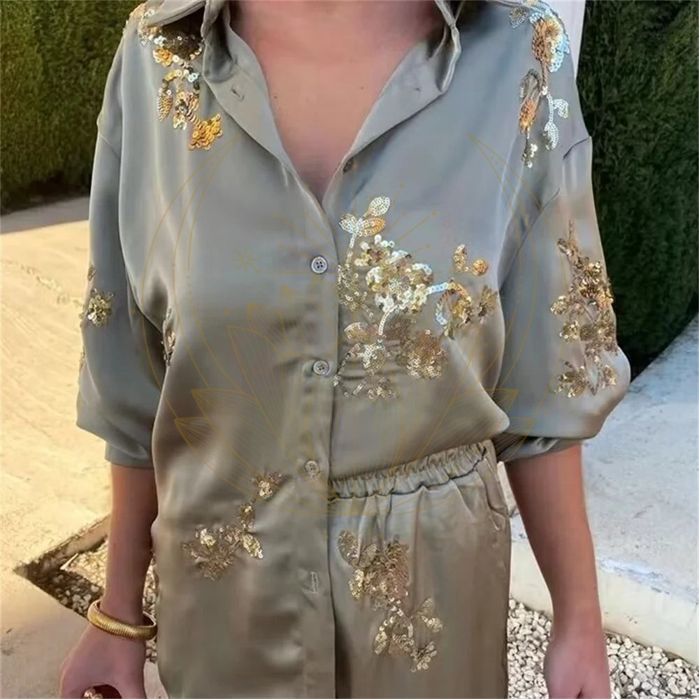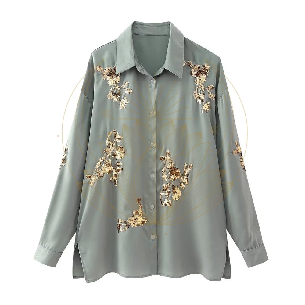La chemise est également embellie de boutons pour un look à la fois classique et sophistiqué, tandis que les paillettes dorées apportent un brillant discret.