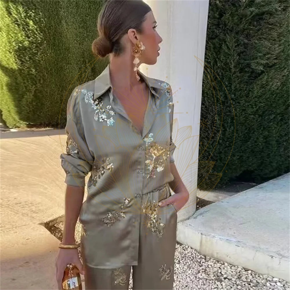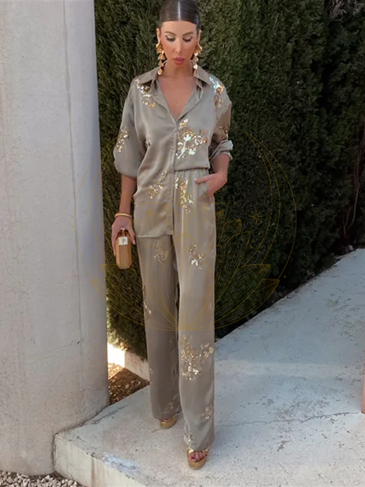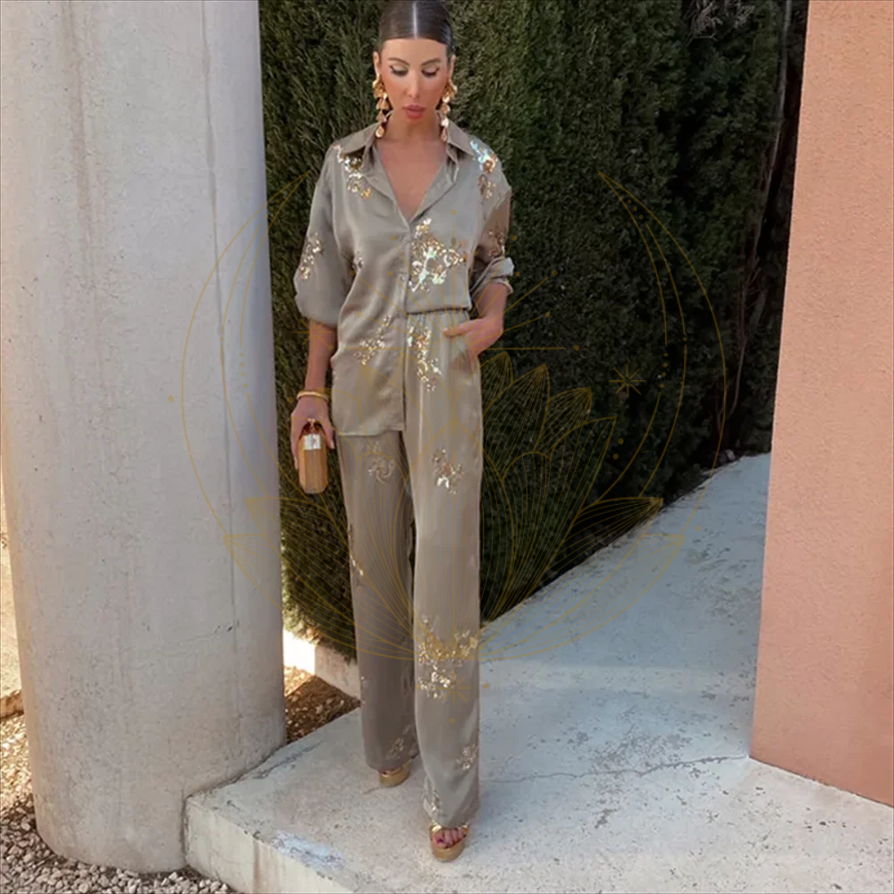 Le col à revers de la chemise ajoute une touche d’élégance, tandis que le pantalon à jambes larges confère une note moderne. Les manches longues offrent plus de couvrance, idéal pour les soirées fraîches.