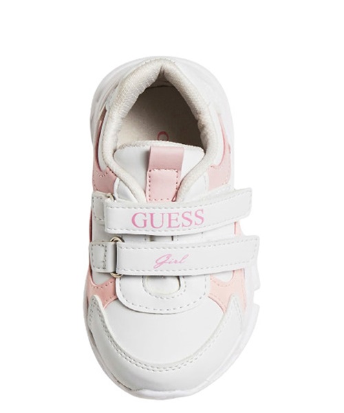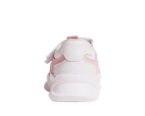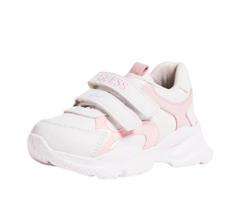 Baskets blanches pour fille avec des contrastes roses. Fermeture avec double sangle Velcro réglable. Tige en similicuir, intérieur en tissu et semelle en caoutchouc.