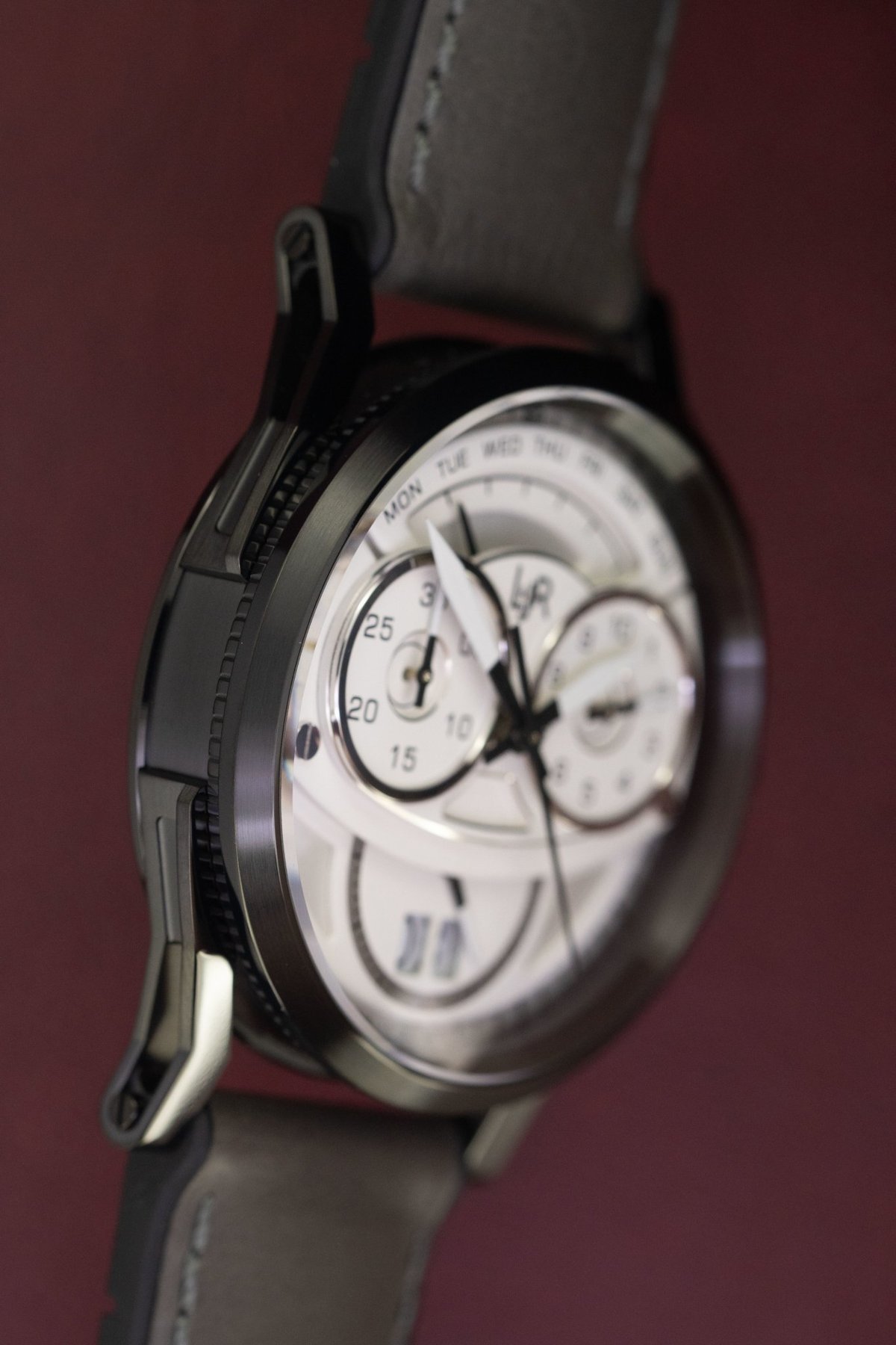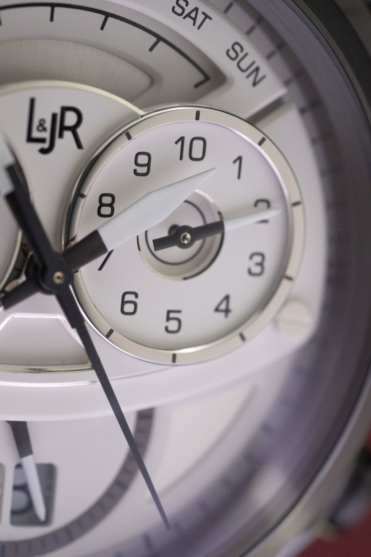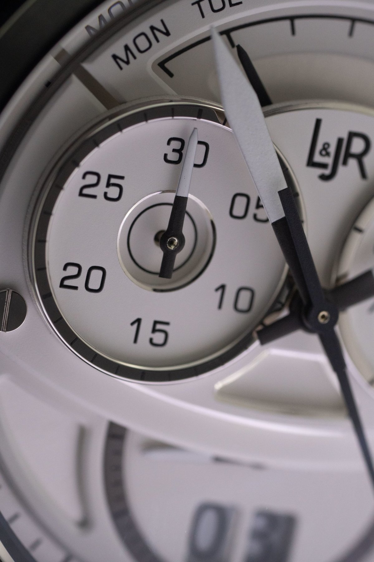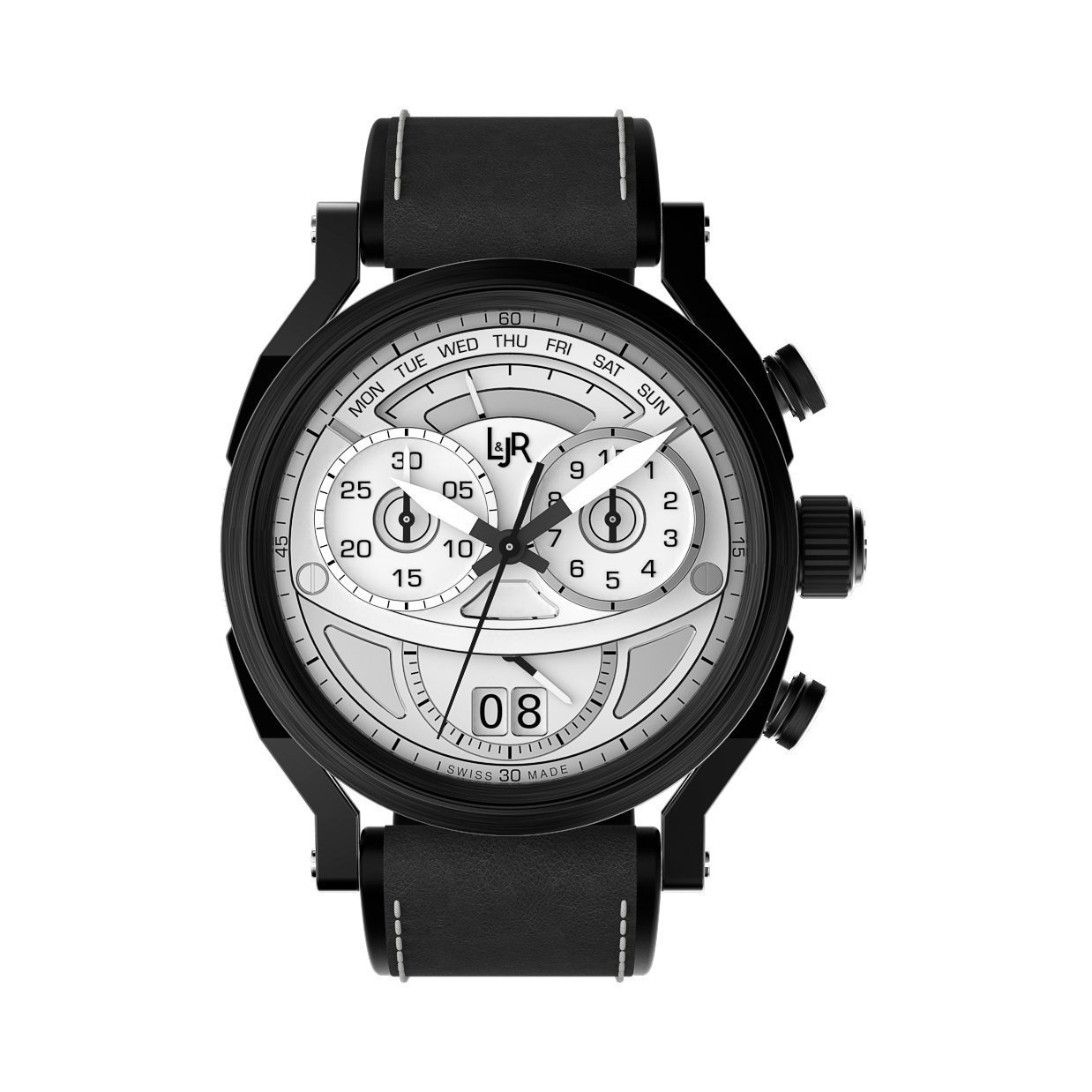 Le chronographe L & JR exprime son objectif sportif grâce à un design solide et dynamique, caractérisé par la signature L & JR d’un cadran en trois dimensions, disposé sous un verre saphir bombé. Comme tous les cadrans L & JR, le chronographe est original et stylé tout en étant très intuitif à lire. Chacune de ses couches répond à un objectif fonctionnel et esthétique distinct. Le fond fermé a une construction vissée garantissant une étanchéité à 50 mètres. Sur ses surfaces en acier, un mélange de finitions circulaires et micro-sablées vient compléter le logo central gravé – une expression supplémentaire de la modernité confiante de la marque.