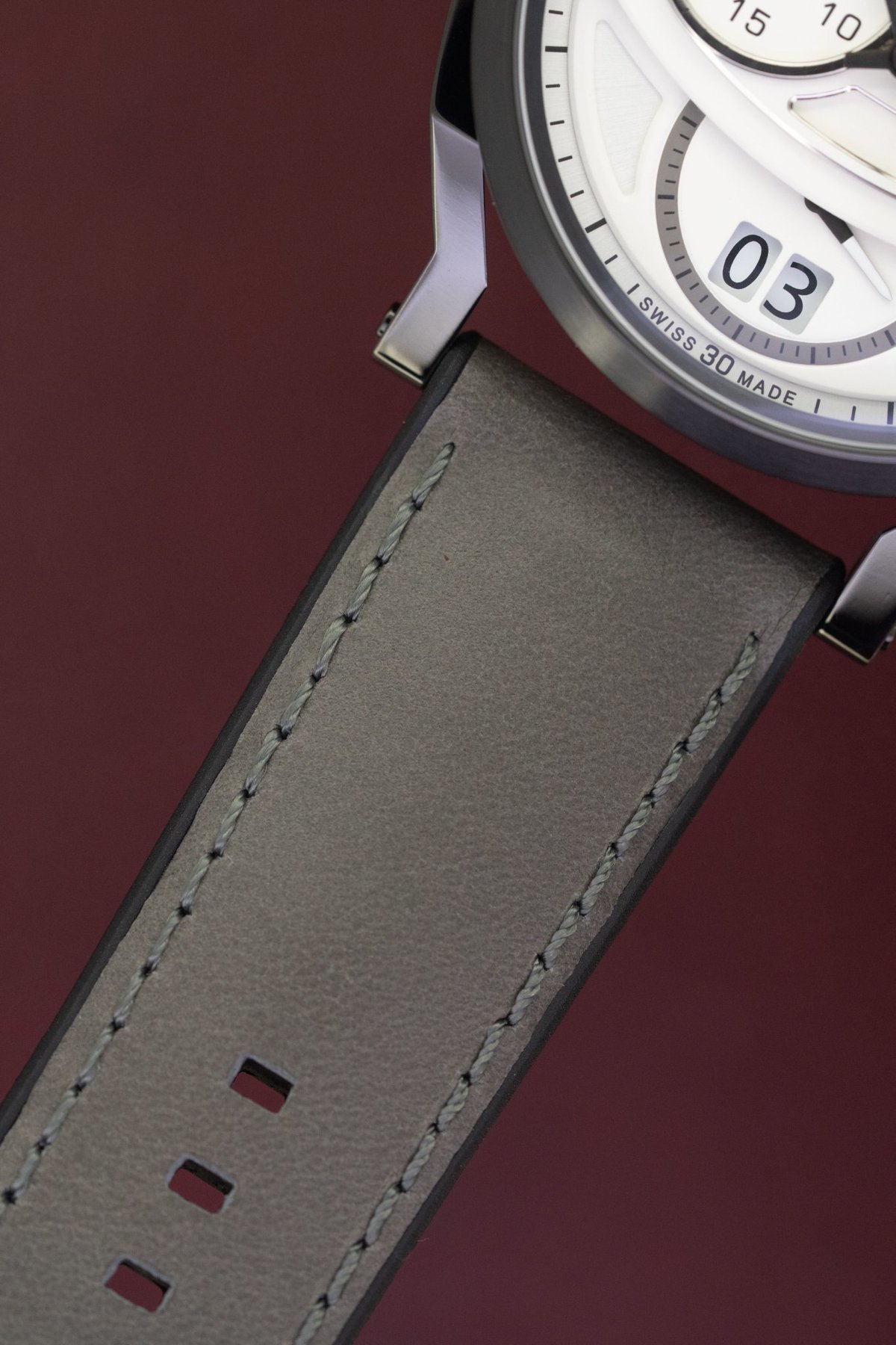 - Matière du bracelet : cuir de veau gris lissé