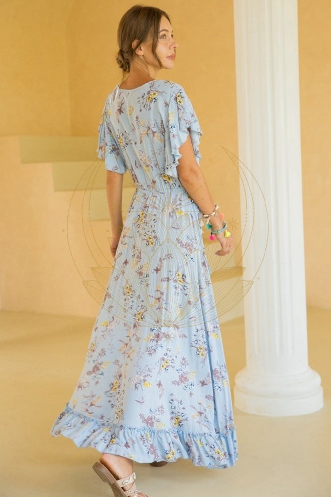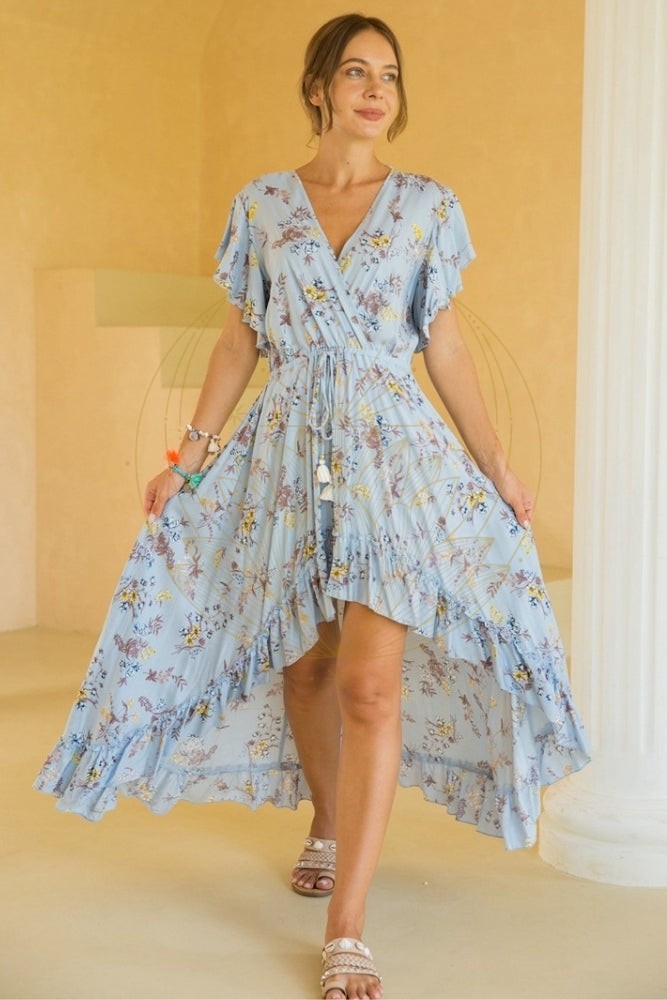 La coupe asymétrique apporte une touche d’originalité à cette robe bohème à imprimé fleuri. Le décolleté cache-cœur met délicatement en valeur la poitrine. La taille est marquée et définie par des liens à nouer décorés de pompons. Cette robe bohème asymétrique est parfaite à la fois pour les vacances ou pour des occasions spéciales comme un mariage.