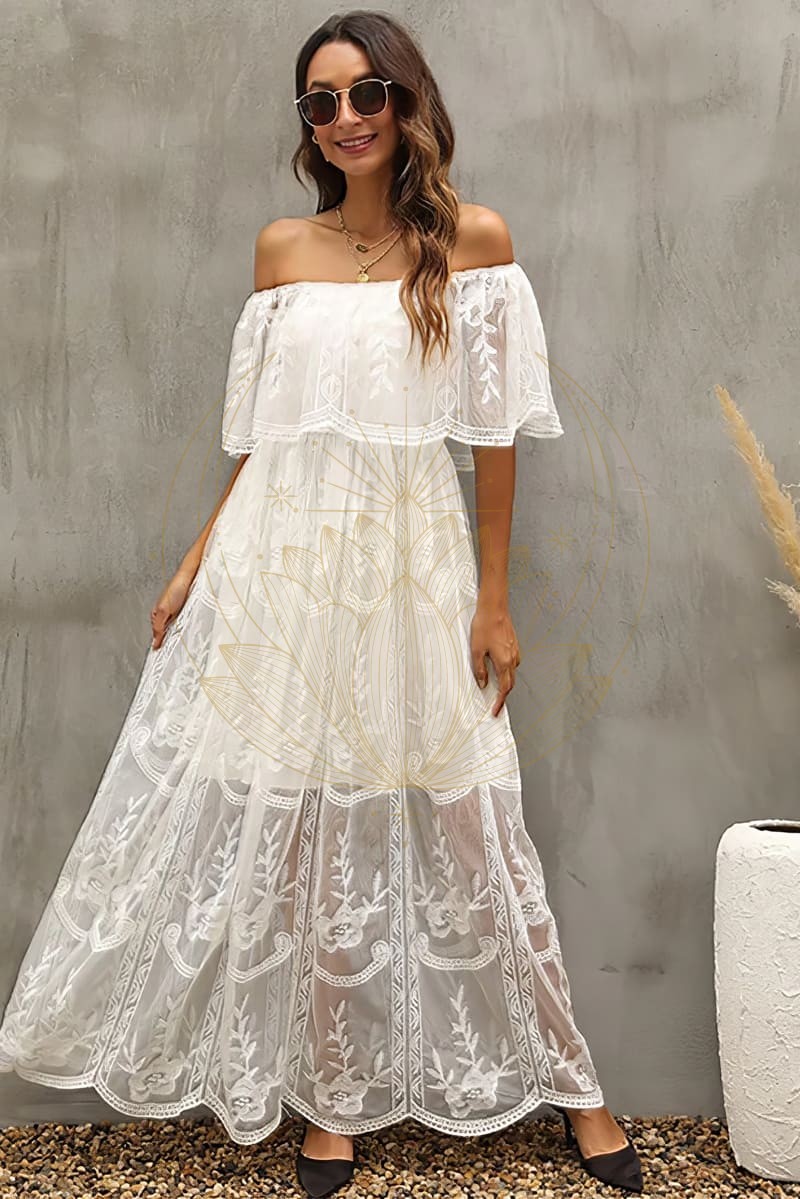 Vous recherchez une robe romantique et bohème qui vous fera vous sentir comme une reine ? Ne cherchez pas plus loin que notre Robe Bohème Blanche à Col Bardot !