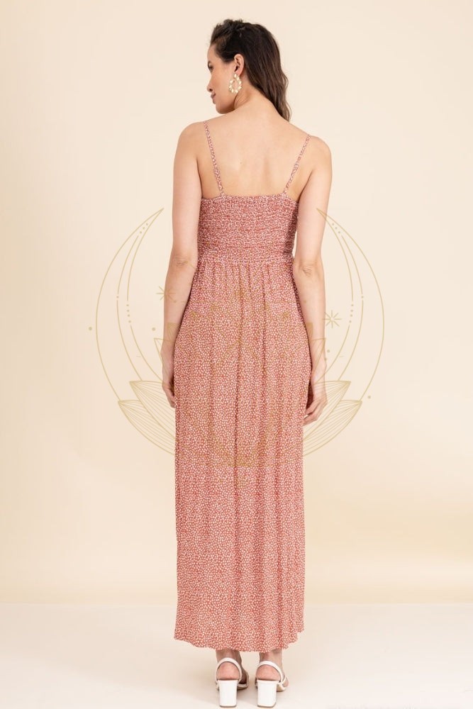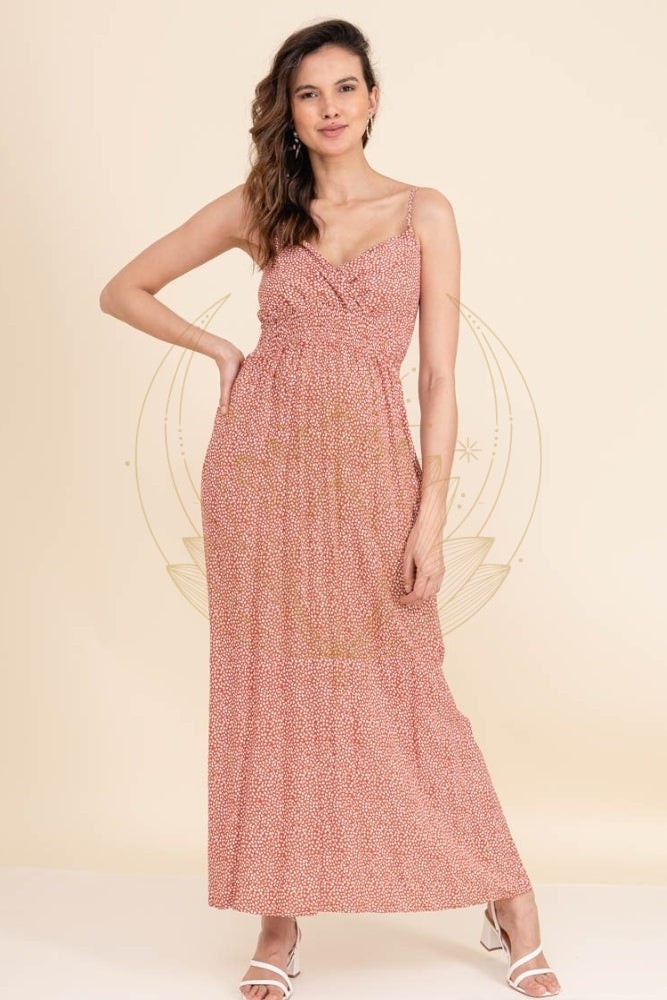 Aérienne et élégante, cette robe maxi séduit à chaque pas. On aime particulièrement sa nuance vieux rose qui reste au cœur de la mode bohème. Fabriquée en coton 100%, elle est douce et légère pour un confort optimal. Adaptée à toutes les silhouettes, cette robe maxi style empire met en valeur la taille haute et affine la silhouette. Avec son décolleté en V cache-cœur, ses bretelles fines et sa taille smockée, elle sublime la poitrine avec raffinement.
