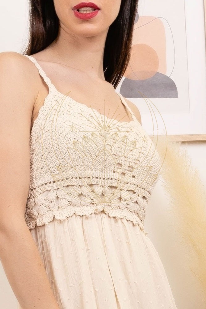 Amour instantané pour cette robe bohème asymétrique en crochet. Grâce à son haut en crochet, ses petits pompons et sa coupe révélant les jambes, elle ajoute une touche chic à notre look. Aucun doute, elle est idéale pour faire quelques pas de danse. Parfaite avec des sandales ou des talons, elle convient parfaitement pour être une invitée élégante à un mariage bohème.