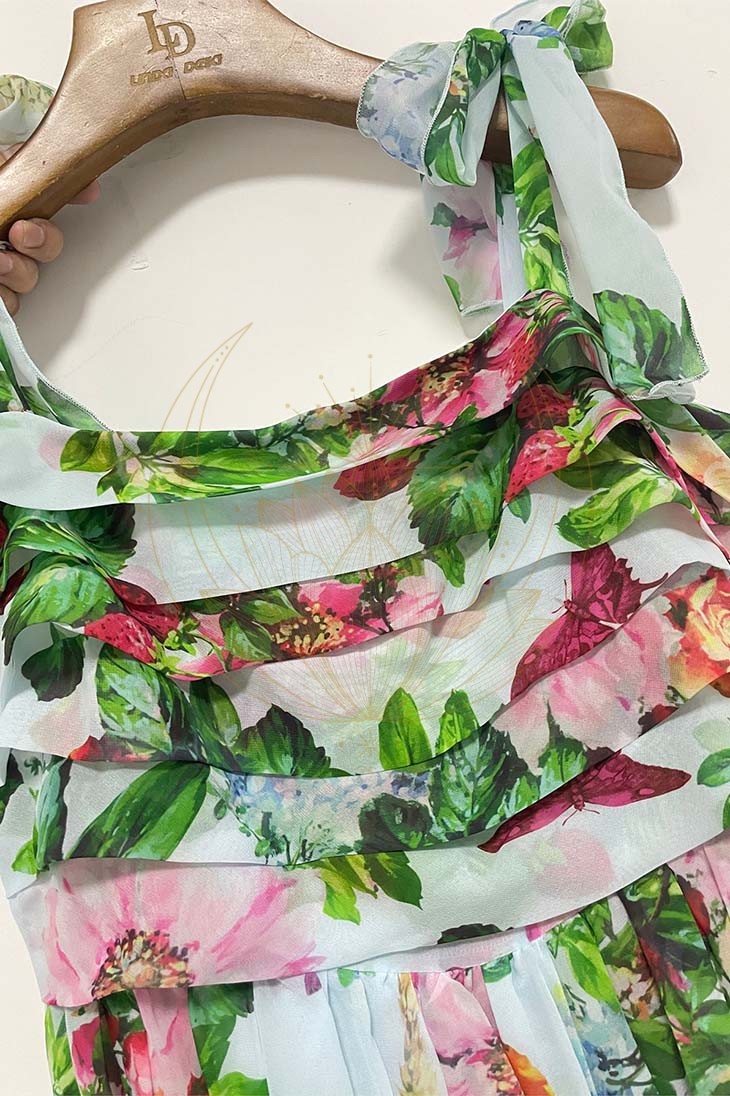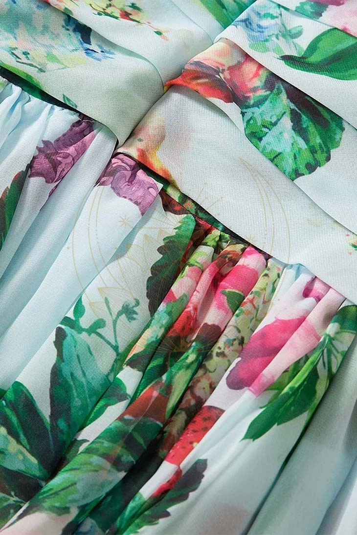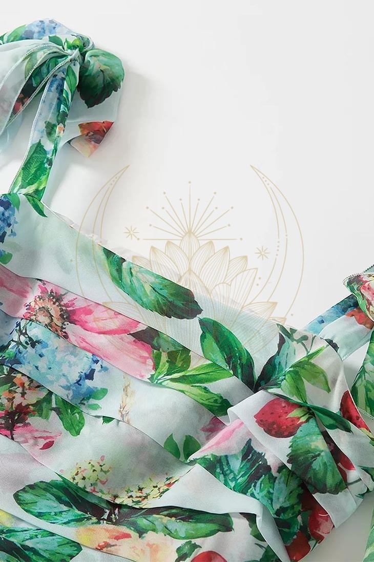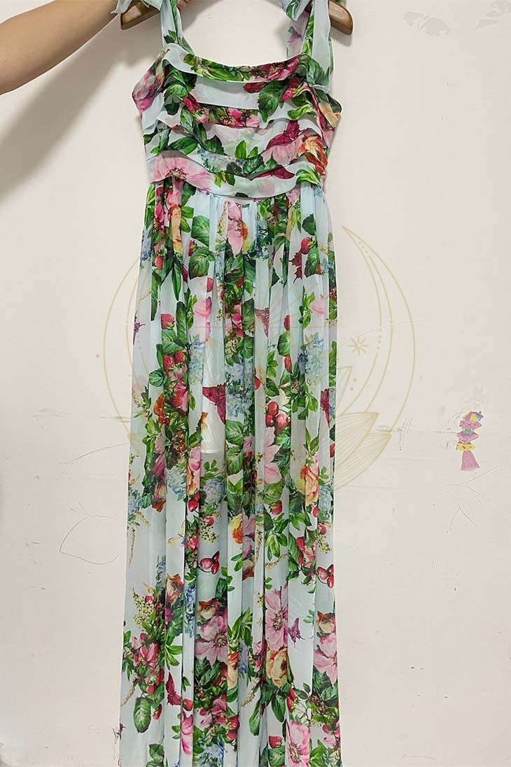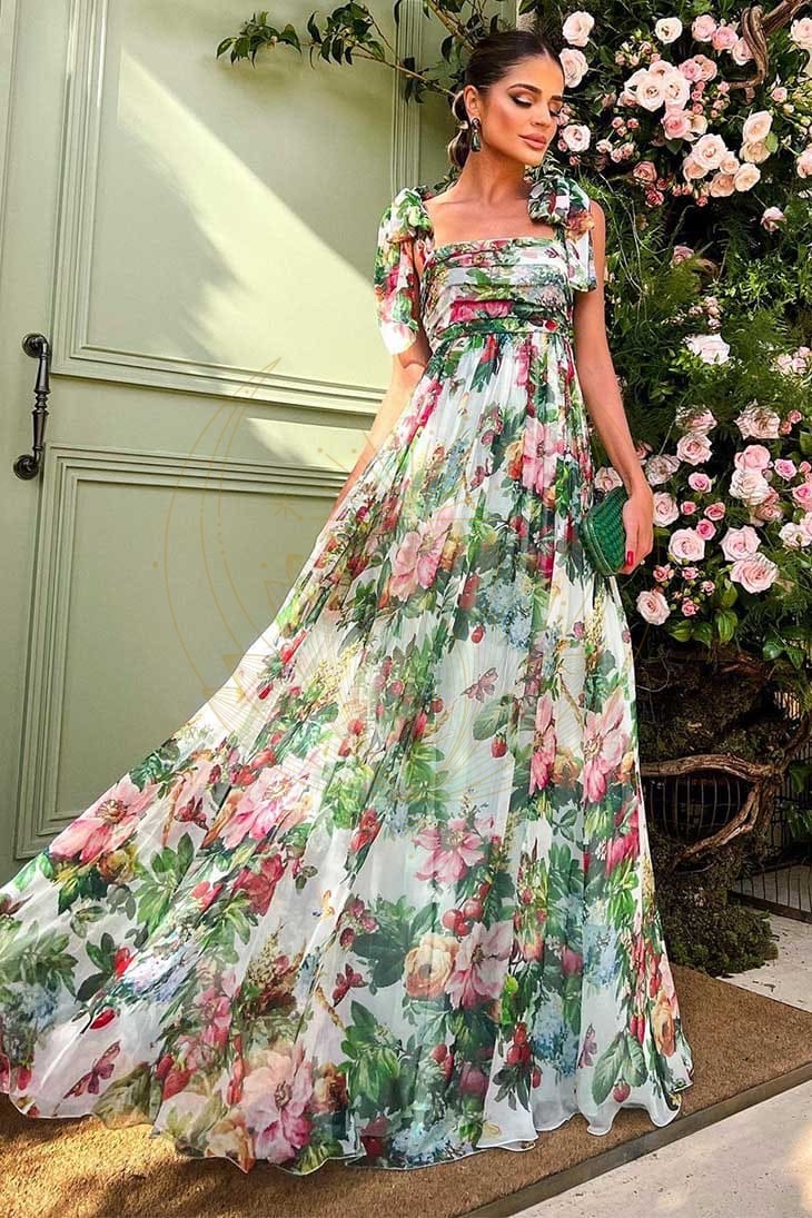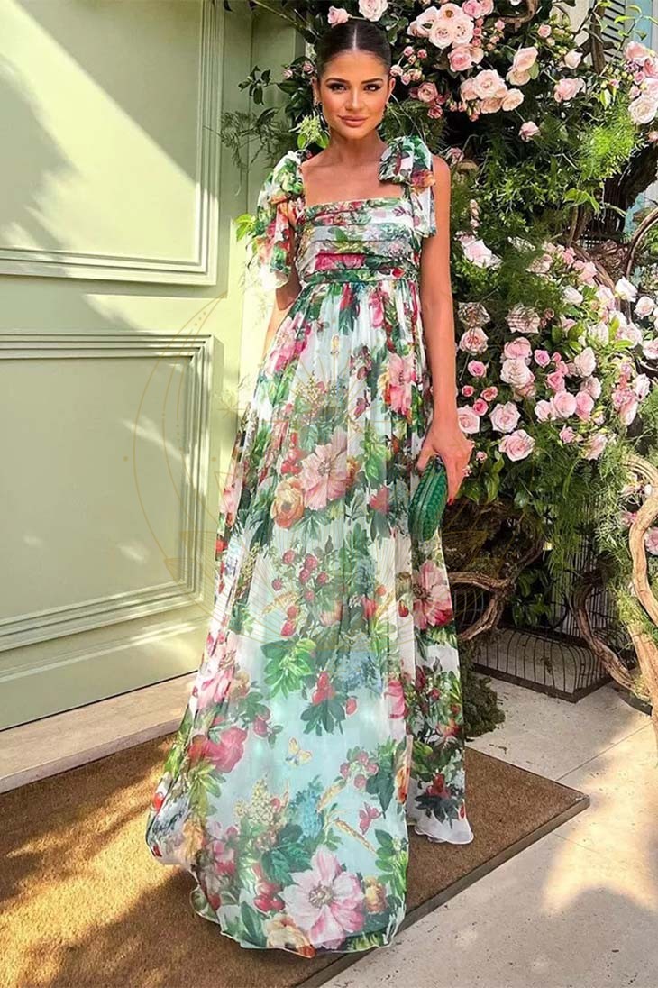 Sublimée par des motifs floraux raffinés, cette robe dispose d’une encolure carrée et d’épaules découverte de manière asymétrique, lui offrant ainsi une élégance bohème. Sa jupe fluide et plissée tombe avec grâce, tandis que son dos nu apporte une touche de séduction inattendue.