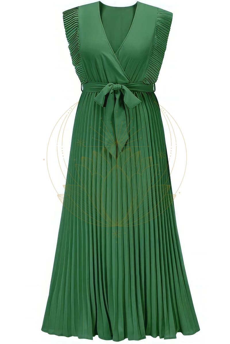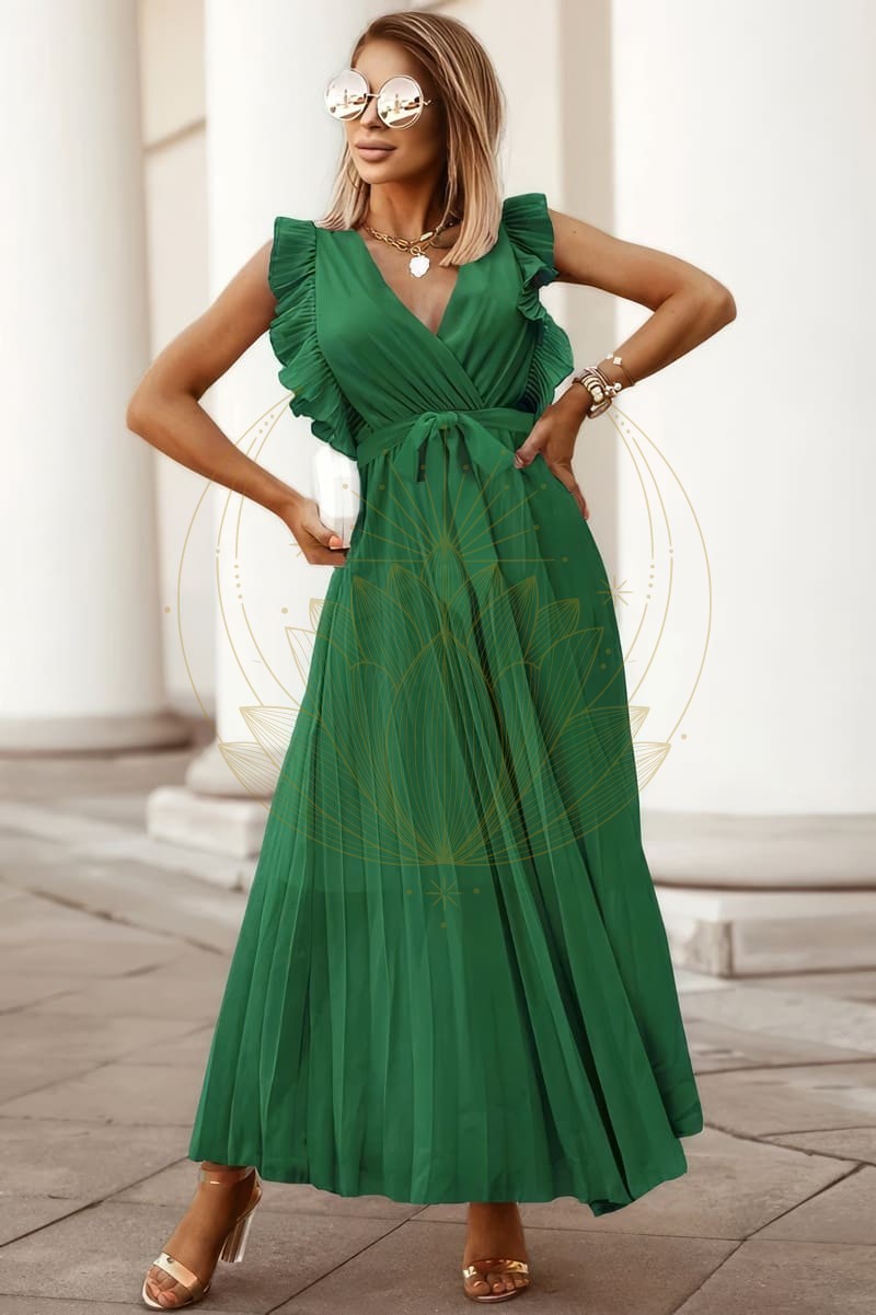 Avec une découpe fluide et gracieuse, la Robe Longue Style Bohème Vert Émeraude – Lucrèce célèbre la femme sophistiquée et audacieuse. Sa couleur vert émeraude fait écho à une nature abondante, tandis que son design plissé accentue les courbes pour une silhouette légère et élégante. Le décolleté plongeant en V met en valeur la poitrine, et les volants aux épaules apportent une note romantique. Sa ceinture ajustée affine les formes, soulignant délicatement la taille. Les plis de la jupe confèrent une fluidité captivante, rappelant une promenade estivale dans un jardin luxuriant.