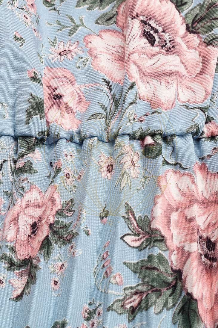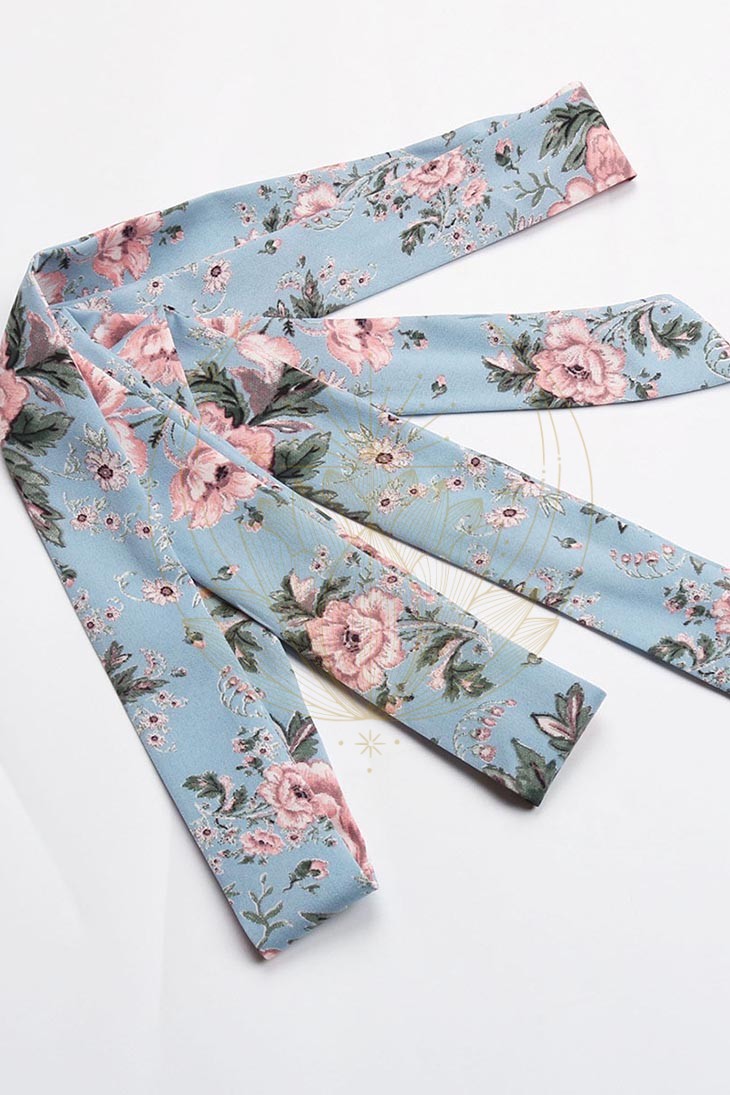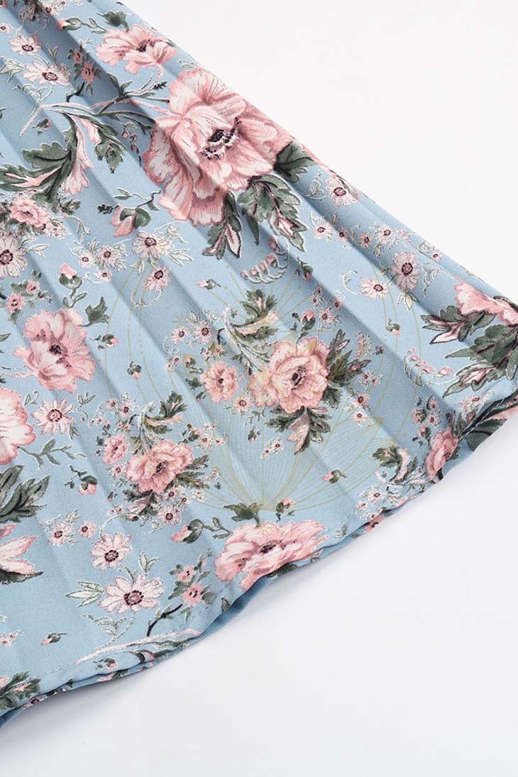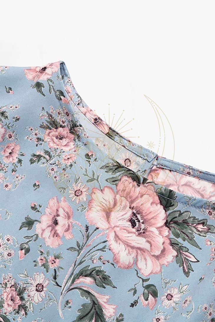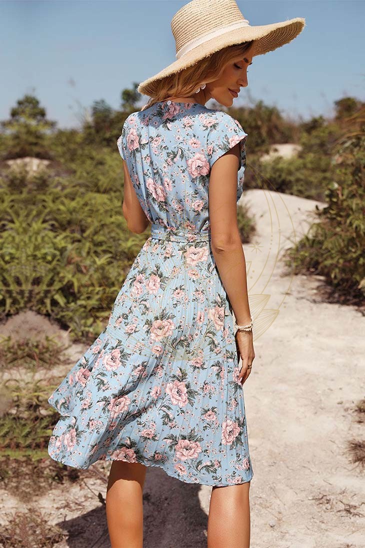 Cette ravissante robe mi-longue présente de superbes motifs floraux turquoise, une ceinture à la taille et des manches courtes volantées. Idéale pour toutes les occasions printanières et estivales, que vous vous baladiez dans un jardin en fleur ou profitiez d’un pique-nique décontracté.