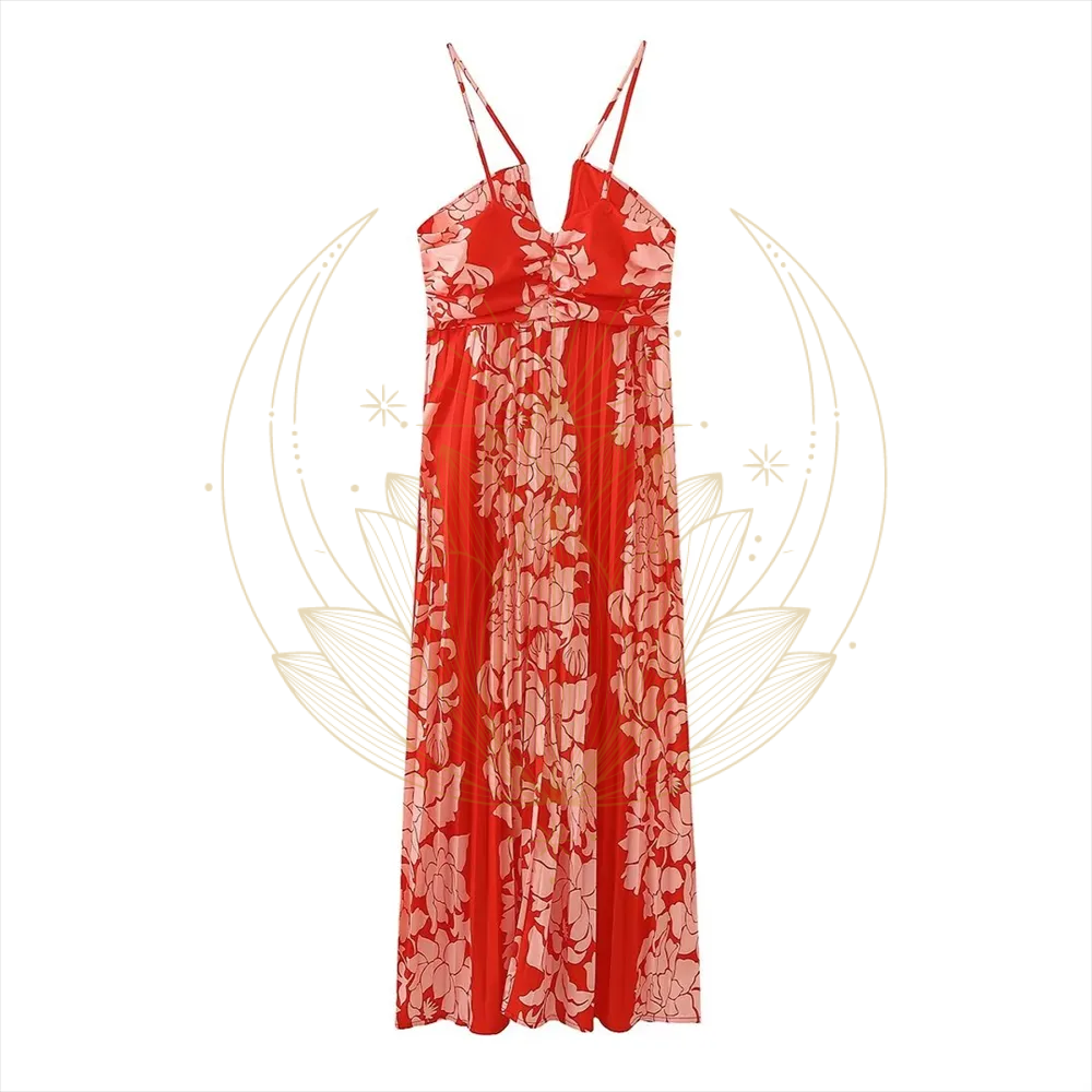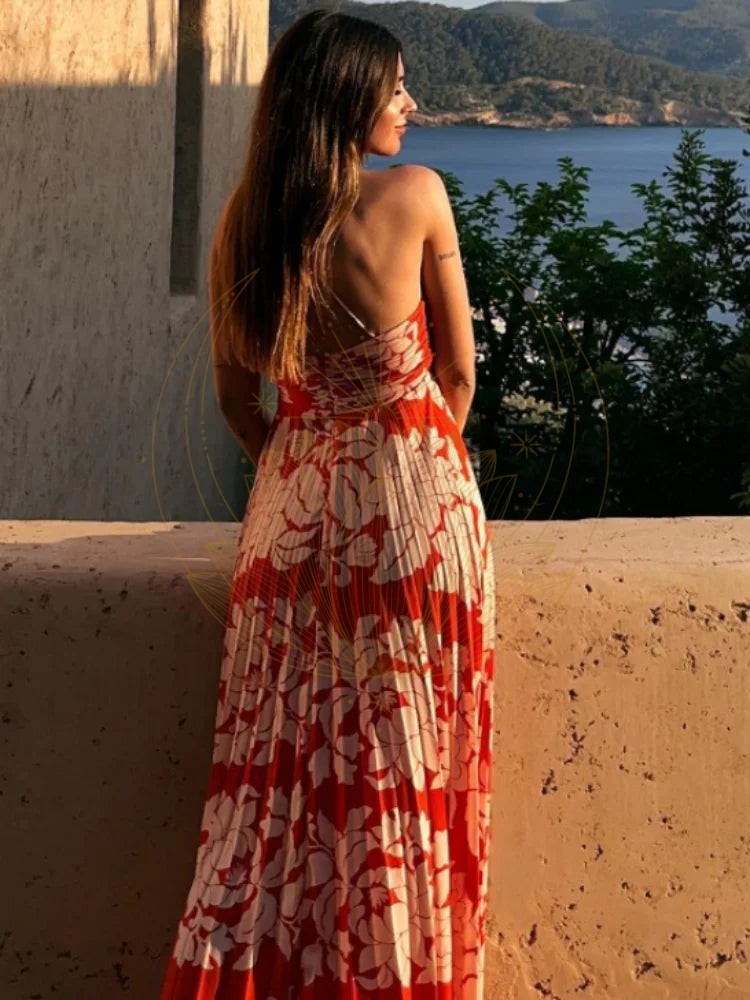 L’ imprimé floral rouge et blanc introduit une note de fraîcheur et de pétillance, rappelant la splendeur des jardins en pleine floraison l’été. Le rouge vif de la robe capte les regards et incarne l’énergie estivale.