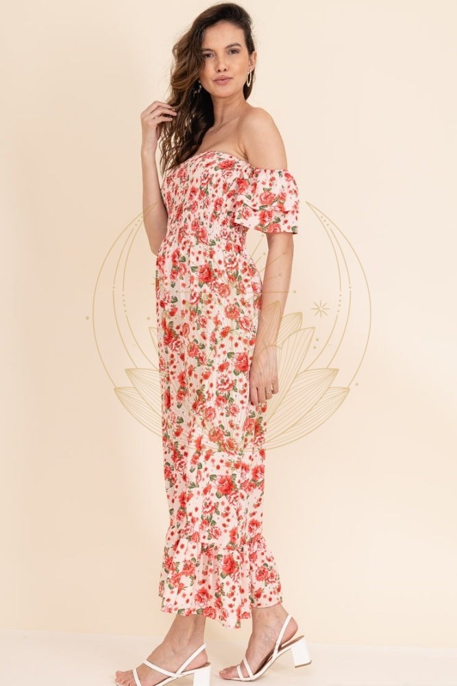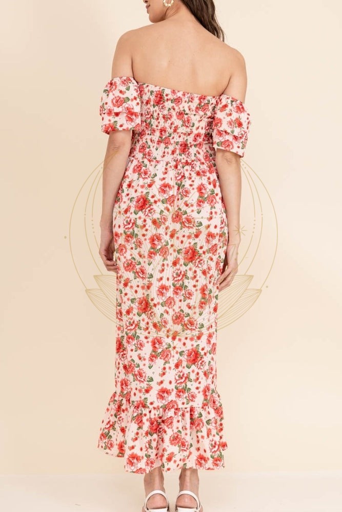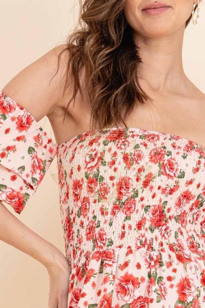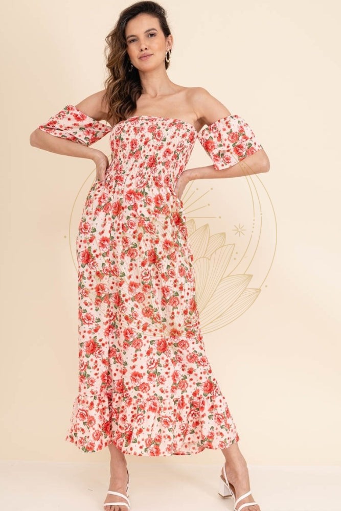 Cette robe bohème aux épaules découvertes est une véritable ode au romantisme et à la sensualité. Son imprimé floral rose annonce l’arrivée des beaux jours. Avec son bustier smocké, elle met en valeur une poitrine galbée. En bas, un ourlet volanté ajoute du mouvement à la silhouette. Que vous la portiez avec des sandales ou des bottines, cette robe bohème romantique à fleurs est idéale pour un rendez-vous ou un mariage.