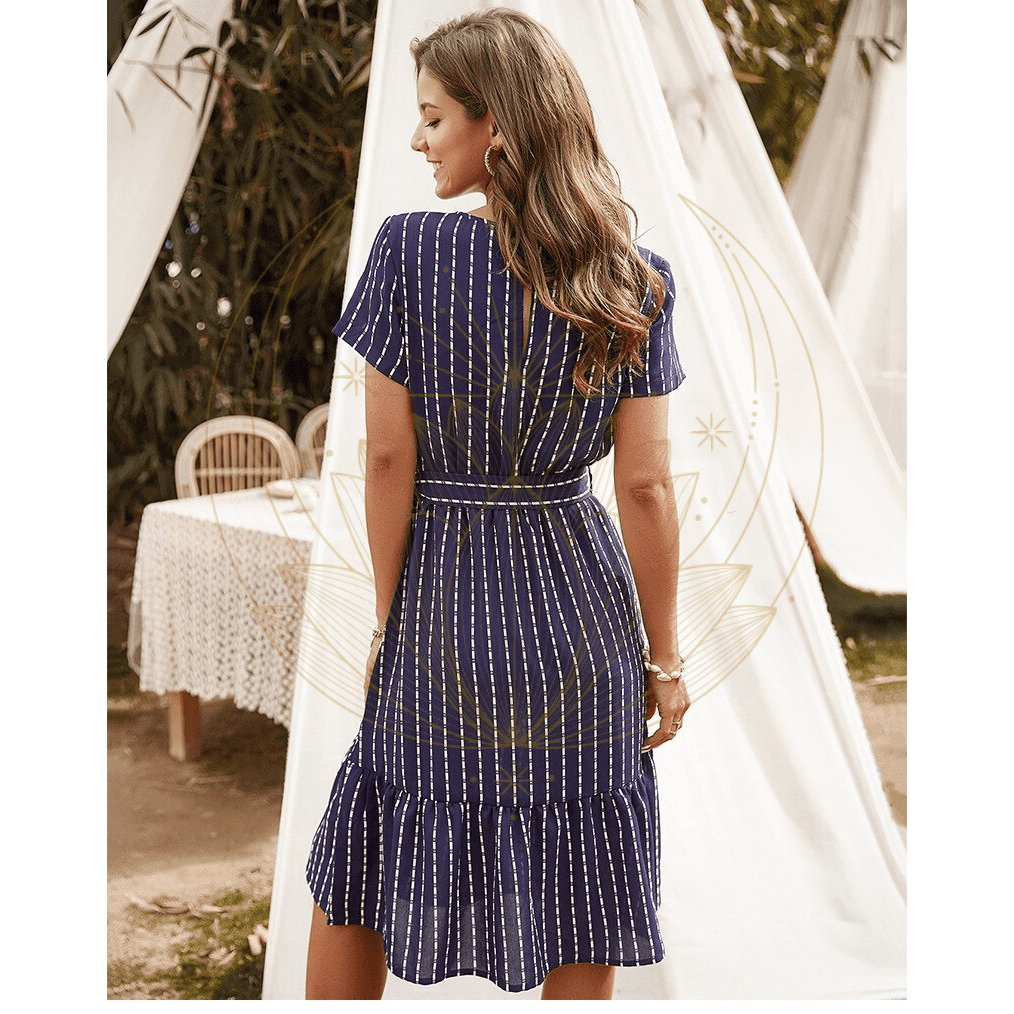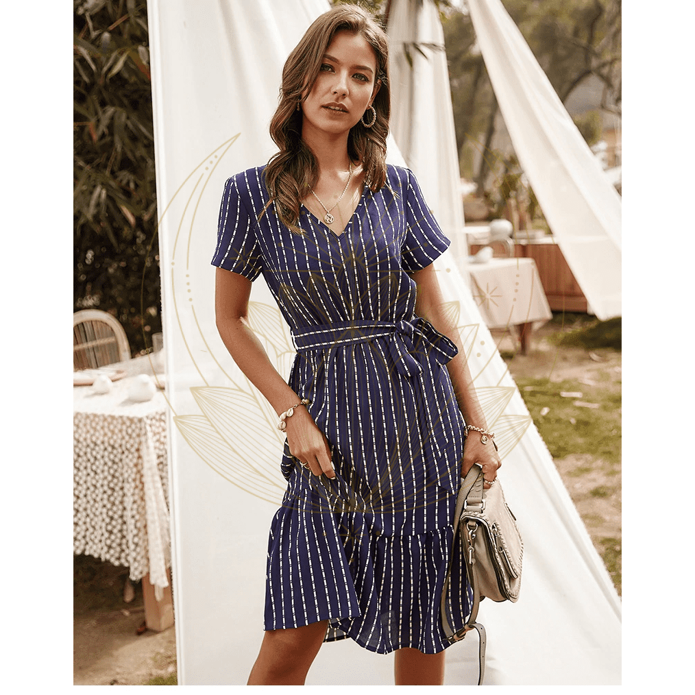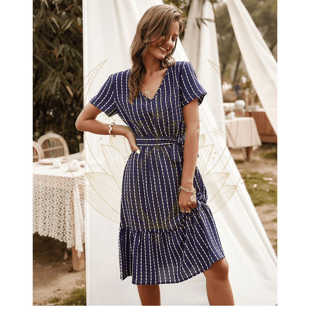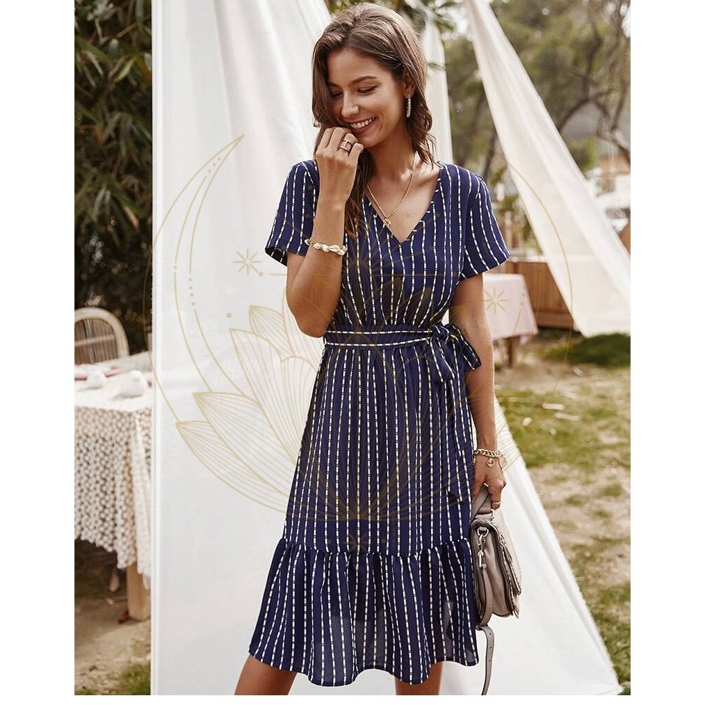 Cette robe se distingue par son col en V et sa ceinture nouée aux hanches qui met en valeur la silhouette avant de s’évader. La coupe asymétrique ajoute une touche dynamique à la tenue. Agrémentez-la avec des bijoux, des sandales à talon pour une allure féminine et un chapeau pour parfaire l’ensemble.