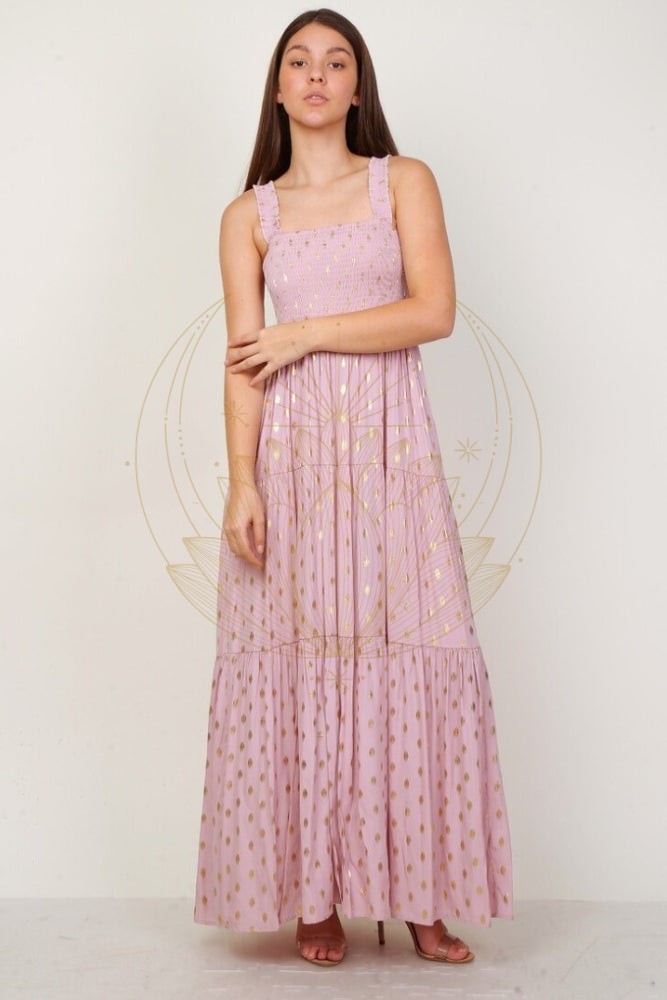 Ajoutez une touche d’élégance à votre vestiaire avec cette sublime robe longue en rose poudré ornée de pois dorés et agrémentée d’un haut smocké. La coupe empire raffinée souligne votre taille alors que le col carré met délicatement en valeur votre décolleté.