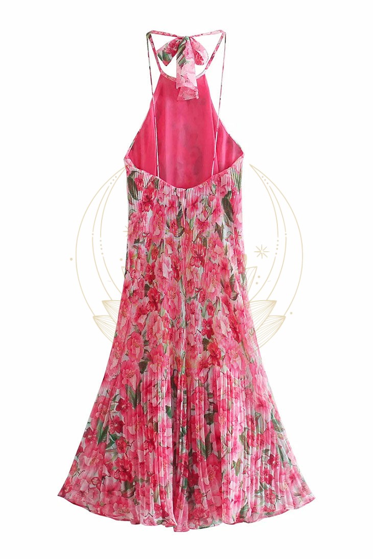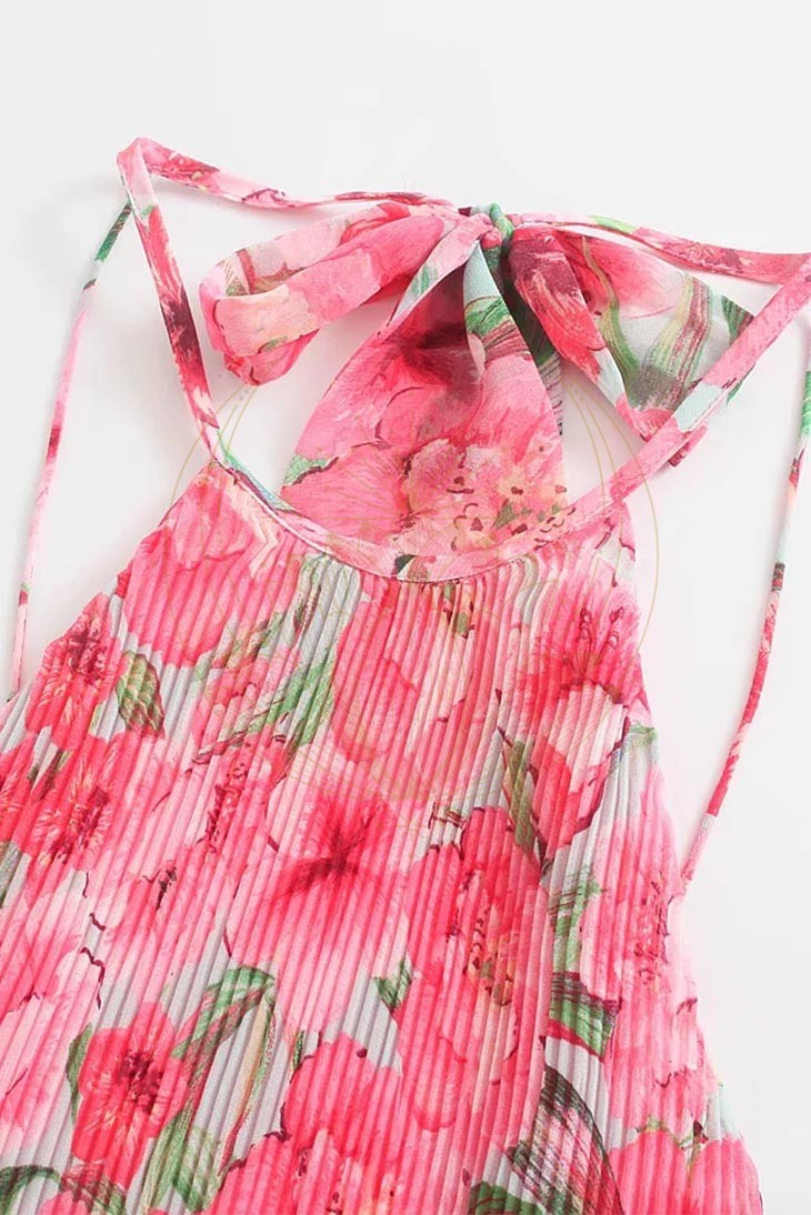 Ce modèle enchanteur arbore des motifs raffinés de fleurs roses et de feuilles vertes, avec une superbe coupe dos nu. Sans manches, cette robe est à la fois chic et flatteuse, garantissant de captiver l’attention où que vous alliez.