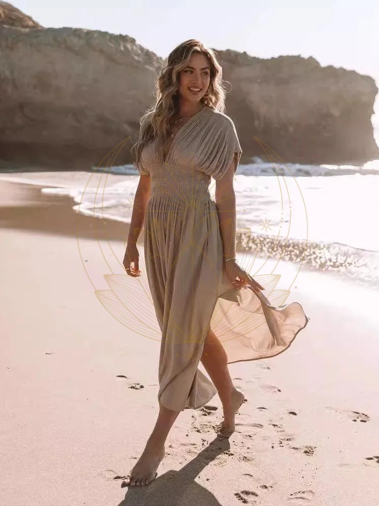 Robe longue estivale bohème chic beige : Élégance décontractée avec une fente ajoutant féminité et légèreté