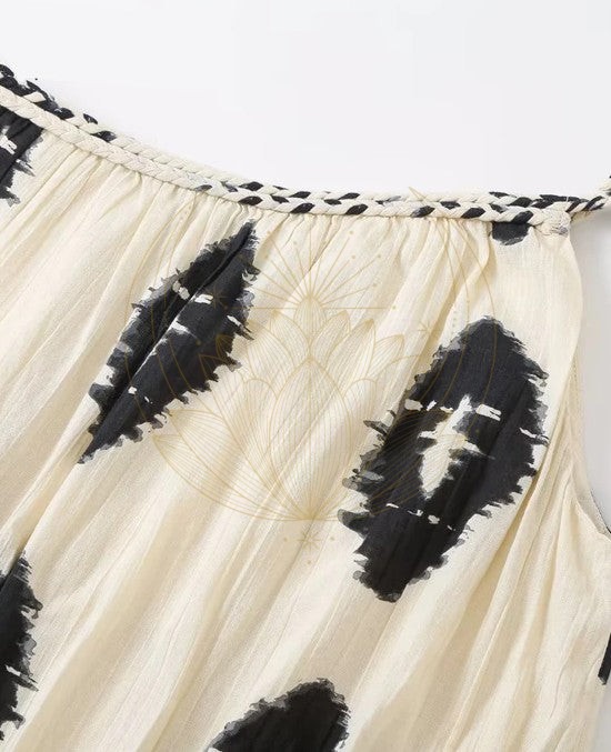 Cette tenue envoûtante représente l’alliance idéale entre la modernité sophistiquée et le charme du passé. Conçue avec une coupe avantageuse, elle marie parfaitement les plis délicats à un imprimé audacieux, créant ainsi un look inoubliable.