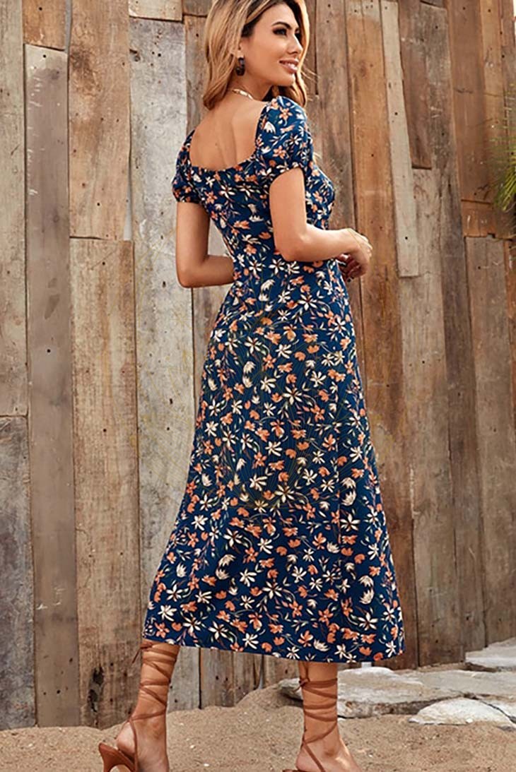 Découvrez notre Robe Romantique Bohème Chic ! Idéale pour toute femme désirant vivre une romance dans une élégance absolue. Le bleu marine de cette robe est très chic, avec de magnifiques motifs floraux rouges et blancs qui captivent l’attention. La jupe fendue ajoute une touche à la fois séduisante et féminine, tandis que le col carré offre une élégance distincte et originale. Les manches courtes et bouffantes apportent une touche flatteuse et joviale. Ce vêtement vous sublimera, vous rendant encore plus majestueuse et rayonnante.