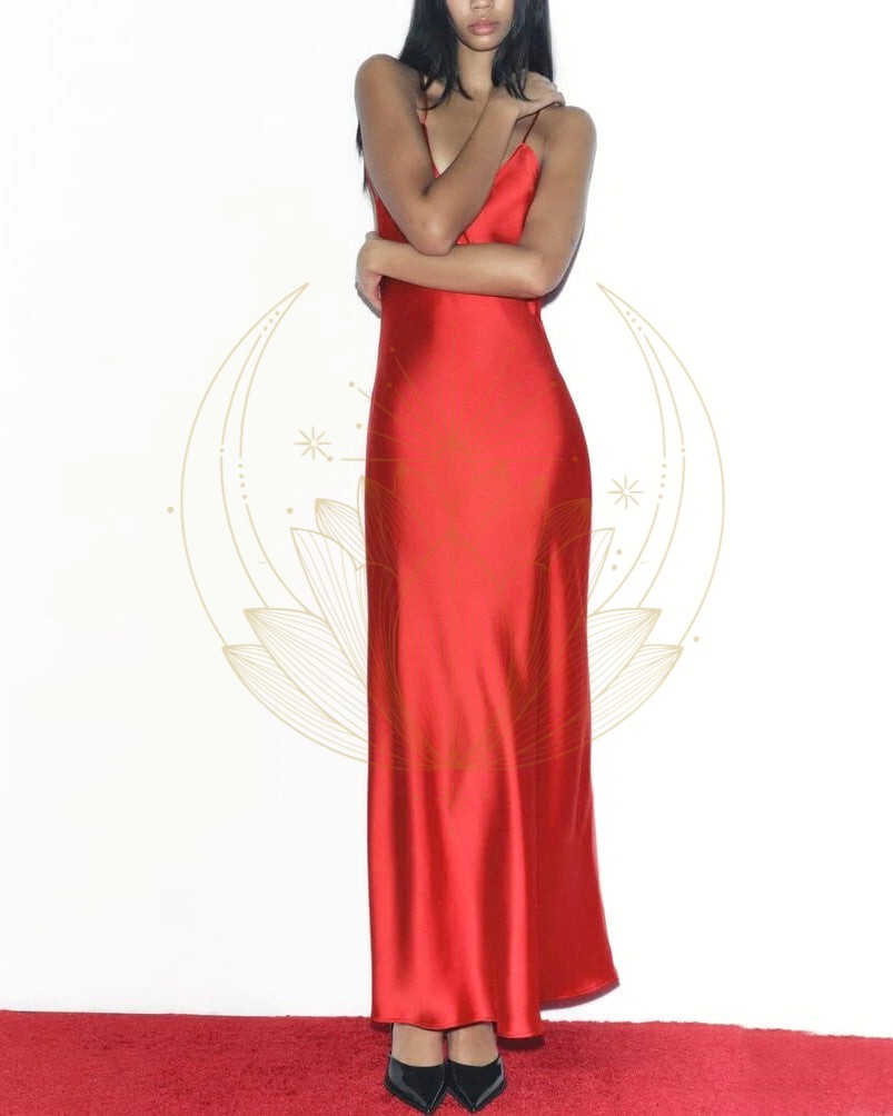 Robe longue satinée rouge: Fusion d’élégance et de sensualité pour une silhouette fluide destinée aux occasions spéciales.