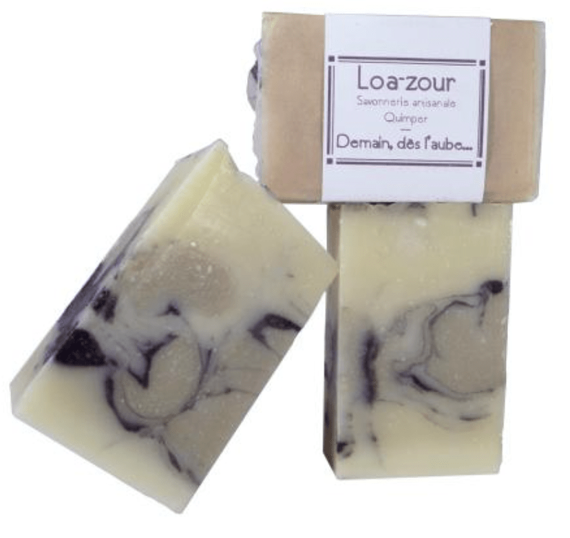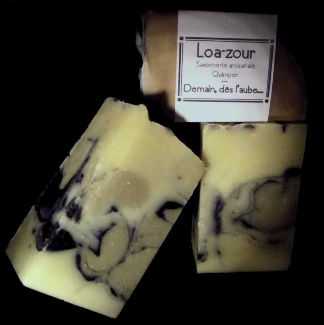 « Demain dès l’aube… » est fabriqué à partir d’huile d’olive, de coco, de colza et de beurre de karité. Parfumé aux huiles essentielles de menthe poivrée, palmarosa, romarin et patchouli. Enfin, l’utilisation d’argile verte et de charbon végétal apporte cette couleur et cet aspect au savon.